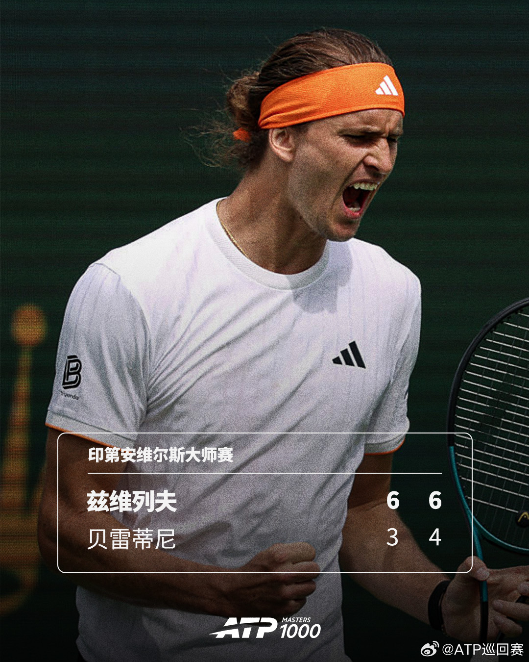ATP1000 印第安维尔斯大师赛第二轮,4号种子兹维列夫以6-3 6-4完胜贝雷蒂尼,轻松取得开门红,也将双方交手记录改写为5-3,第三轮他将对阵卡拉比利与布兰登·中岛的胜者。