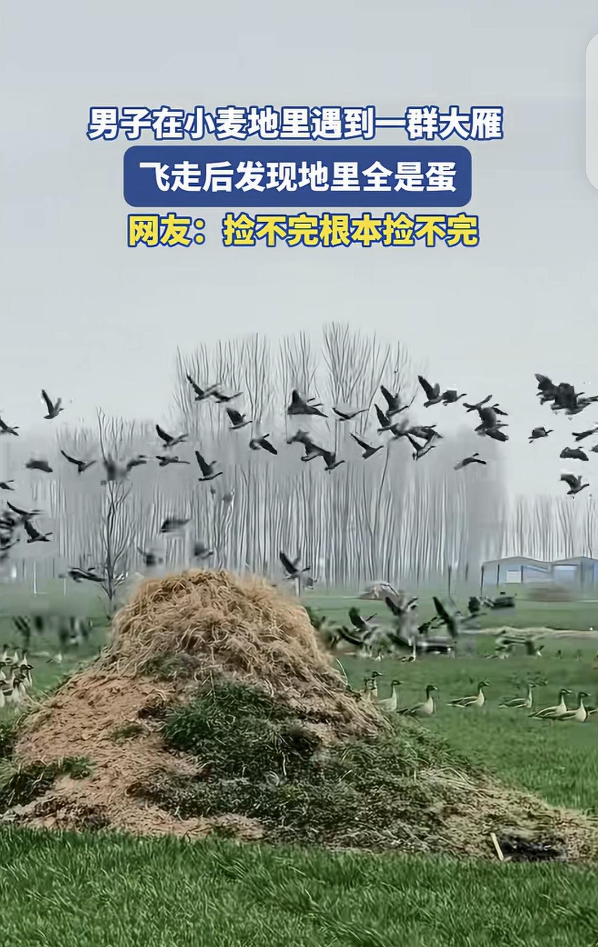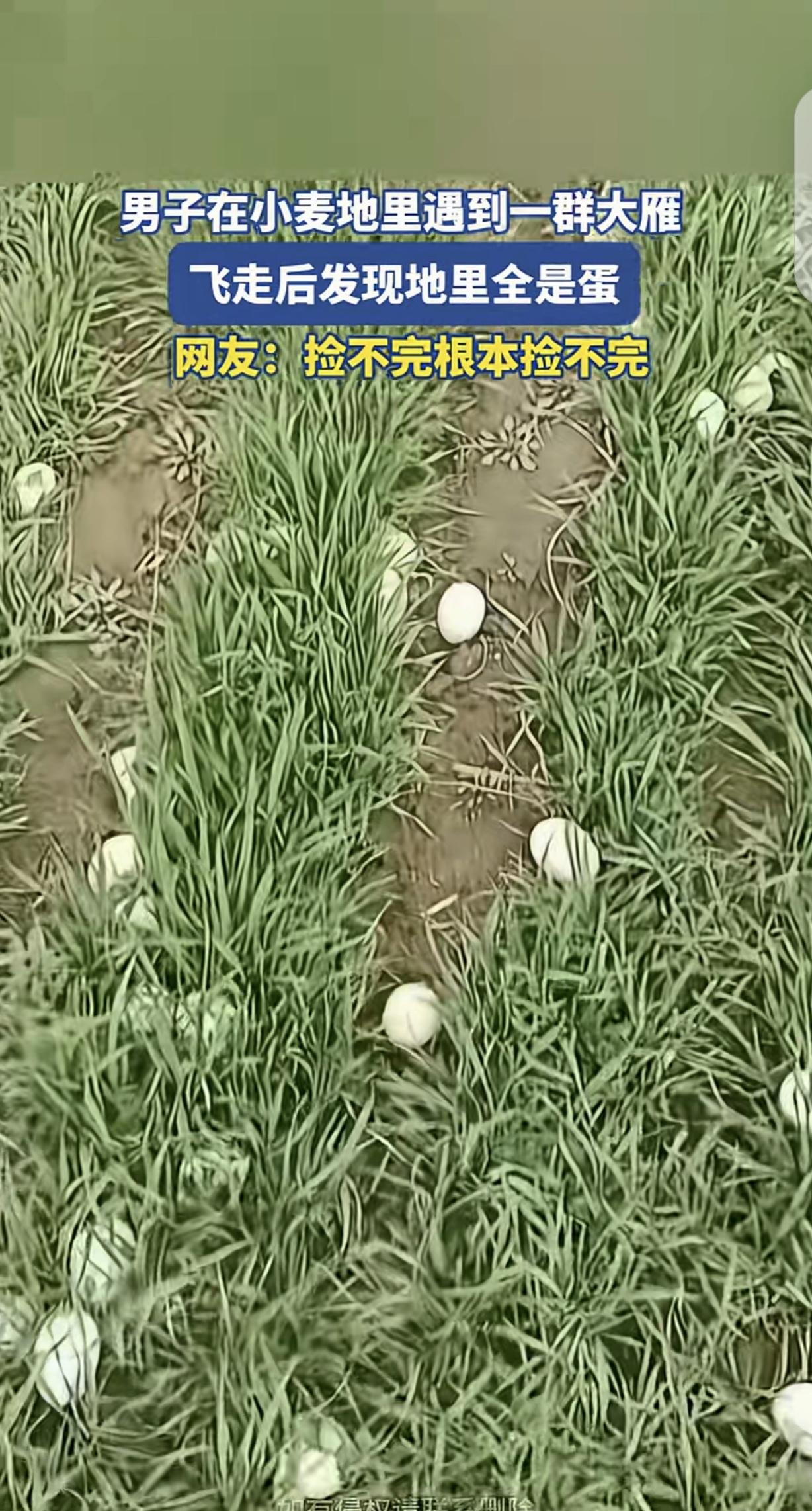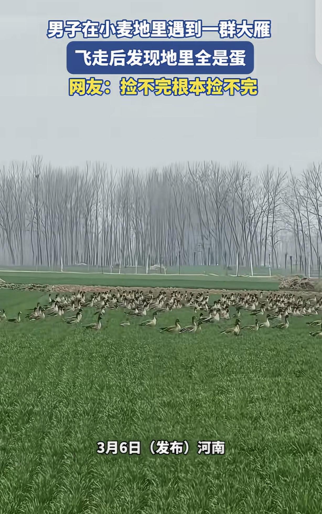 “泼天的富贵?”河南,一男子看见一群大雁,趴在小麦地里,他感到稀奇,一凑近,大雁呼啦啦全飞了,男子进小麦地一看,被眼前的一幕惊呆了,地里全是蛋,一个挨一个,根本捡不完,男子心花怒放,直呼:发财了!网友:你这干的是端大雁老窝的绝户事!网友:捡完就得去踩缝纫机,一个蛋可以判2年,你数一数,你能在里面呆三生三世吗? 一男子像往常一样在村里溜达,不经意间,他瞧见一群不计其数的大雁,正趴在小麦地里,很是壮观,也不知道它们是歇脚,还是在干嘛? 这场景可不多见,男子顿时觉得稀奇极了,好奇心一下子就被勾了起来,他决定一探究竟。 他蹑手蹑脚的朝着大雁群凑过去,脚步放得很轻,眼睛紧紧盯着那些大雁,生怕惊扰到它们。 可还没等他走近几步,大雁们就像察觉到了危险,“呼啦啦”地全都飞了起来,翅膀扇动的声音,在田野里很是响亮。 大雁们在空中盘旋了一圈,然后朝着远处飞走了,只留下男子站在原地,看着大雁离去的方向,他觉得自己动静也不大呀,怎么就把它们吓跑了呢? 男子心里还惦记着大雁刚才趴着的地方,他赶紧走进小麦地。 当他凑近一看,眼睛瞬间瞪得老大,被眼前的一幕惊得呆住了。 只见小麦地里全是大雁蛋,一个挨着一个,密密麻麻的。 这些蛋圆溜溜的,在阳光下泛着光泽。 男子的心跳加快,顿时心花怒放,兴奋的不得了,这不是中大奖了吗?谁发现,大雁蛋就是谁的,我滴个乖乖,自己这不是发财了吗? 他盘算着,这些大雁蛋能卖不少钱,就是吃,也能吃好长时间。 大雁蛋市场不常见,说不定价格也会比鸭蛋鹅蛋贵一些,但物以稀为贵,即使贵了,有人没吃过,想尝个鲜也会买。 这个视频发到网上后,大家众说纷纭,但很多人跟男子的心态一样,觉得这是天上掉馅饼,泼天的富贵,赚翻了,发横财了。 有人说,从没见过这么大的雁群,一般只有十几只,多的也就二三十只。这种情境是我从小到大就做梦才有的,而且经常做这种梦,今天终于看到了。 感觉不符合科学,这是第一次听说迁徙途中下蛋的,不是应该小雁长大后带着一起迁徙吗? 大雁是保护的动物,蛋也是,得上交,也是鸟保护的一部分。捡完就得去踩缝纫机。完了,它们后代被你一窝端了。 这男子偶然撞见大雁群和满地大雁蛋,第一反应是发财了,这其实挺能理解,毕竟谁都有过“天上掉馅饼”的幻想。 可他没意识到,这看似“泼天富贵”的背后,藏着大问题。 大雁是国家保护动物,它们的蛋同样受法律保护。 男子只看到眼前的利益,想着捡蛋卖钱或者自己吃,却没考虑这么做对大雁种群的影响。 大雁迁徙途中下蛋,是它们繁衍后代的自然过程,要是都像男子这样去捡,大雁的生存和繁衍就会受到威胁。 网上很多人跟男子心态一样,觉得这是发横财的好机会,这反映出大家对野生动物保护意识的淡薄。 保护野生动物不只是保护它们本身,更是维护生态平衡。我们不能因为一时的贪念,就去破坏大自然的规则。 遇到这种情况,正确的做法是及时联系相关部门,让专业人员来处理,而不是想着据为己有。 只有大家都增强保护意识,我们的生态环境才能越来越好。 《刑法》第341条规定,非法猎捕、杀害国家重点保护的珍贵、濒危野生动物的,或者非法收购、运输、出售国家重点保护的珍贵、濒危野生动物及其制品的,处五年以下有期徒刑或者拘役,并处罚金。 大雁蛋属于大雁制品,男子捡大雁蛋想售卖获利,属于违法行为,应受到法律制裁。 对此,你怎么看?