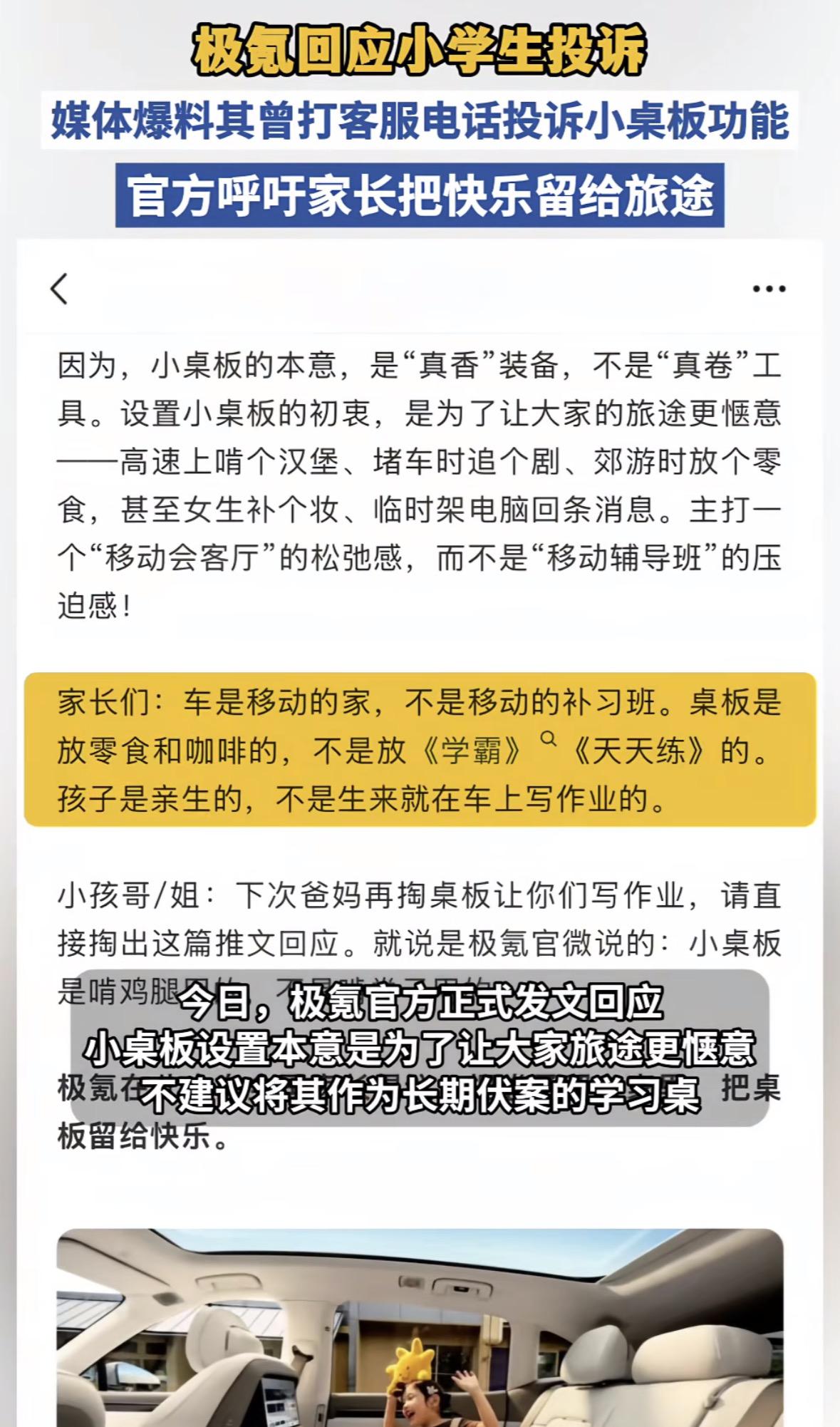 笑不活了,家人们。极氪收到一个小学生的电话投诉,要求他们取消小桌板配置,因为他跟爸爸妈妈出去玩的时候被逼着在车上补作业。。。。 哈哈哈,极氪也是情商高,还正式回应了,呼吁家长在小桌板上多啃鸡腿,少补作业😂😂😂 我觉得这小孩应该庆幸车上可以补作业,在旅行途中,还可以减少一点压力,不然开学前一天熬夜补作业,更痛苦【来自懂车帝车友圈】
