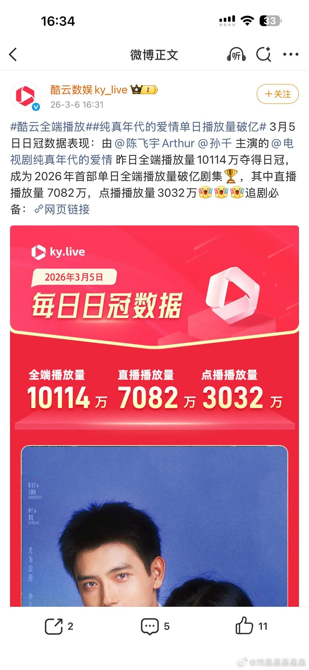 纯真年代的爱情单日全端破亿!2026年首部全端破亿的剧集!牛!