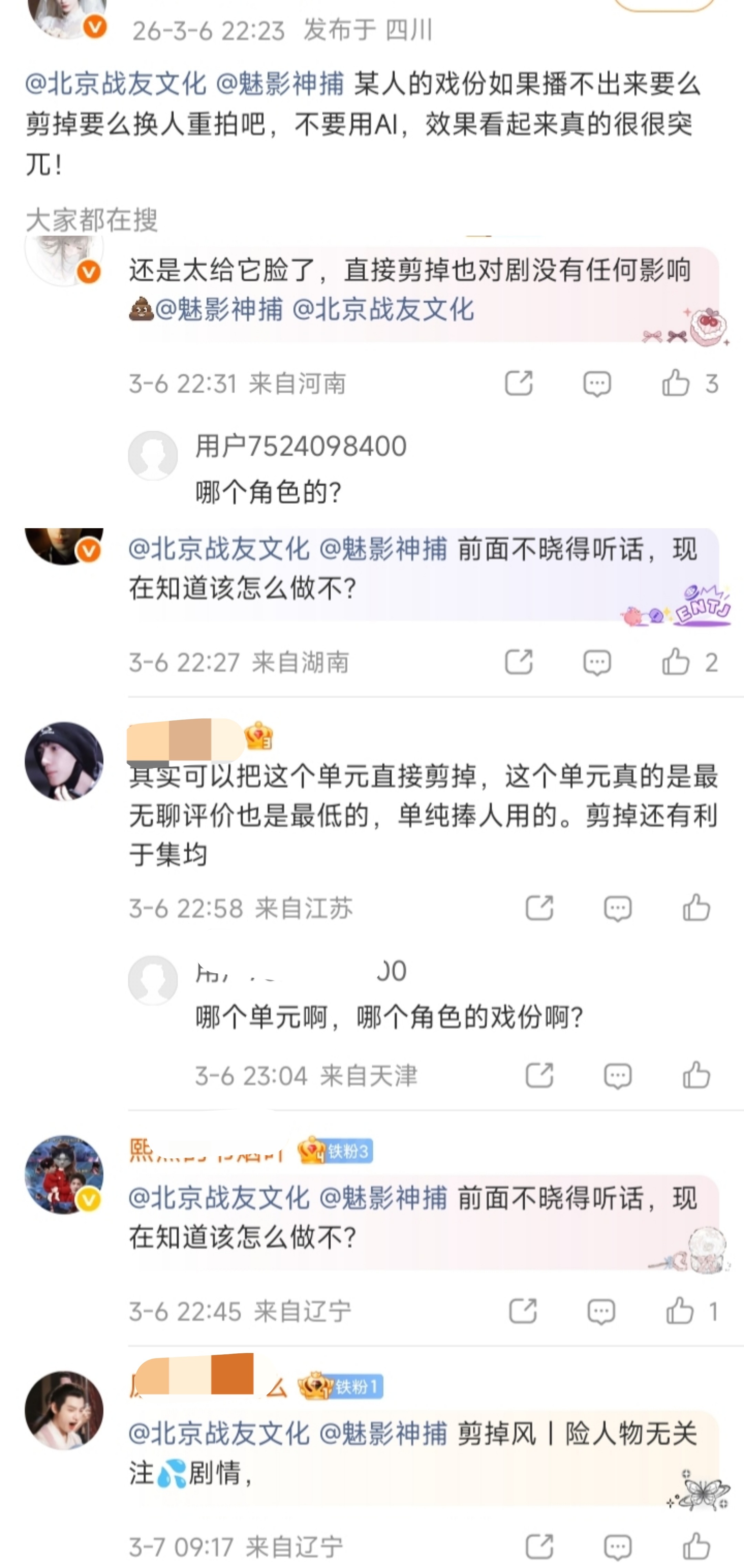 展轩在里面演了一个单元配角双胞胎,现在魅影粉丝@ 北京战友文化,要求删掉风险戏份,粉丝觉得即使ai 也会很突兀。