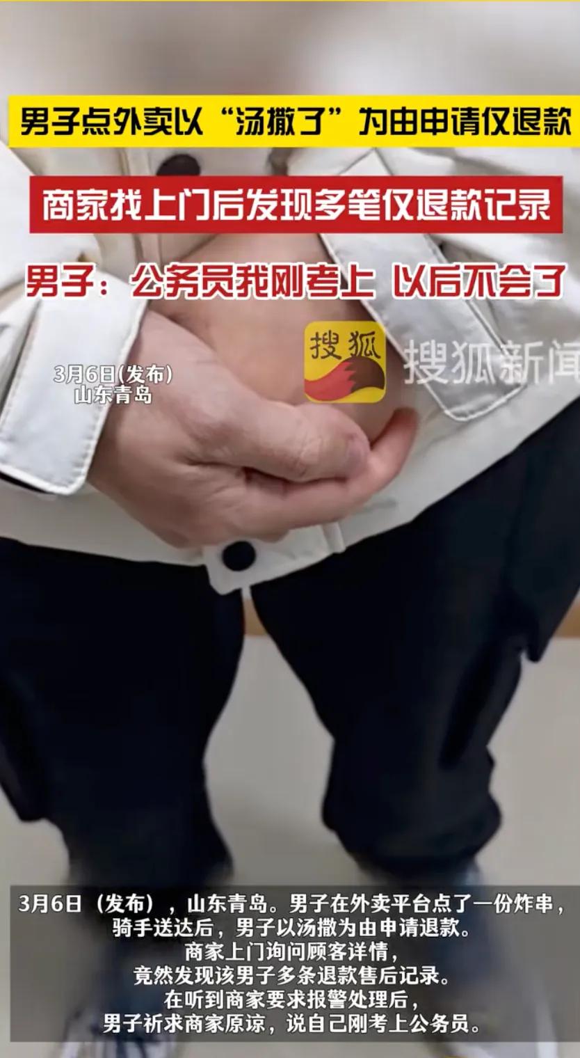 青岛小伙点炸串申请“汤汁漏了”退款,老板上门发现满屏退款记录!一听要报警慌了:我刚考上公务员。 山东青岛有个卖炸串的刘老板,接到一个外卖订单。送出去没多久,平台就弹出来一条退款申请,顾客申请的理由是“汤汁漏了”。刘老板当时就愣了一下,心里嘀咕:炸串哪来的汤汁? 这明显是个外行找的理由,估计平时退款习惯了,顺手就把这个理由写上去了。刘老板没在手机上跟他啰嗦,直接按着送餐地址找上了门。到了地方一看,炸串吃得差不多了,包装袋干干净净,根本没见着漏汤的痕迹。 刘老板也没跟他吵,就问小伙子能不能看看你手机里的订单记录。小伙可能也心虚,就给刘老板看了。 结果这一翻,刘老板当场就火了——满屏幕全是“退款成功”,全是拿各种理由白嫖的,什么“包装破了”、“洒了”,换着商家薅羊毛。 刘老板直接掏手机说要报警,还得做笔录。小伙一听这话,当场就蔫了,连声道歉,最后急了,张嘴来了一句:“大哥,我刚考上公务员,能不能饶我这一回?” 最后刘老板看他确实知道错了,也怂了,就没再追究。后来刘老板接受采访说,自己开店老遇到这种事,一个月光恶意退款就损失上千块,这次实在是气不过才较真的。 刘老板最后选择原谅,说“人都会犯错,不能一锤子把人捶死”。这话在理,也确实大度。 如果你是刘老板,你会不会原谅这位小伙子呢?