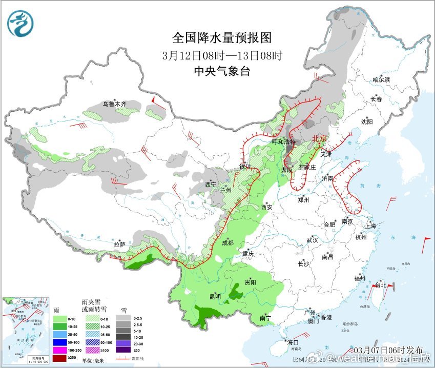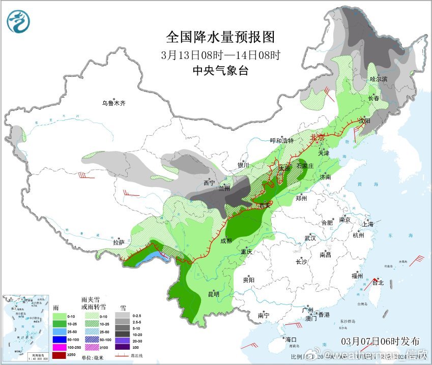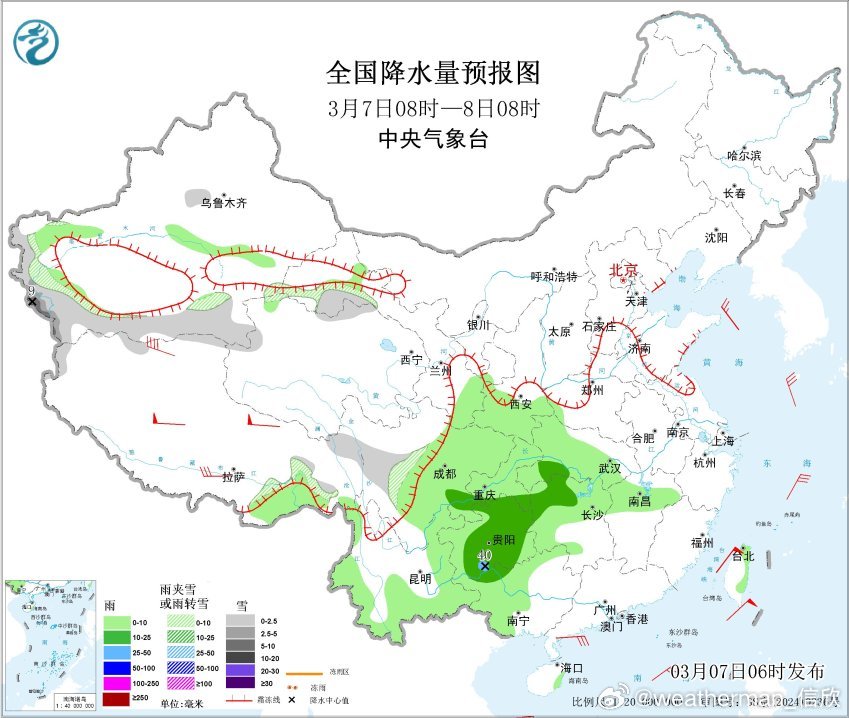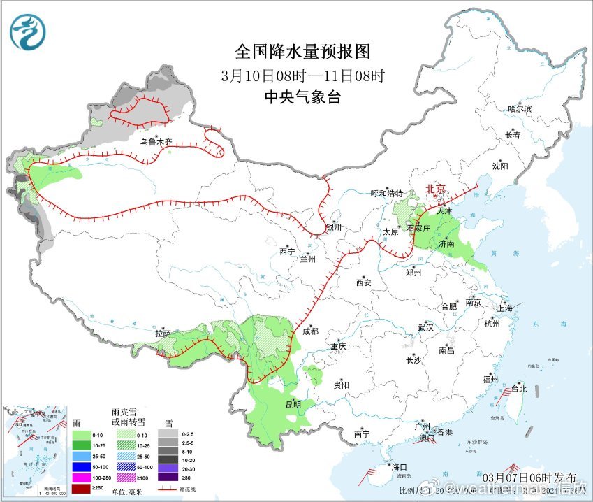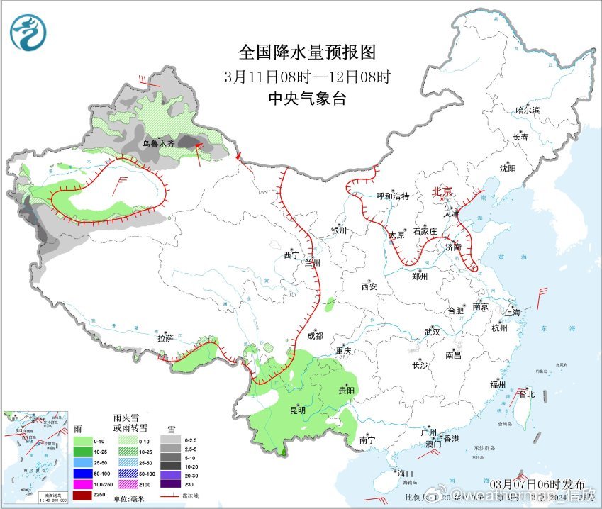 10日以后,江南华南降水减少,西南地区依然多降水。而且干旱的云南西部、四川西部也会出现降水。另外10日夜间-11日有冷空气影响新疆,导致新疆西部和北部有大范围雨雪。之后冷空气东移,与暖湿气流结合,西北地区东部、华北、东北将有大范围雨雪。具体雨雪强度和分布细节,关注后期临近预报修订。