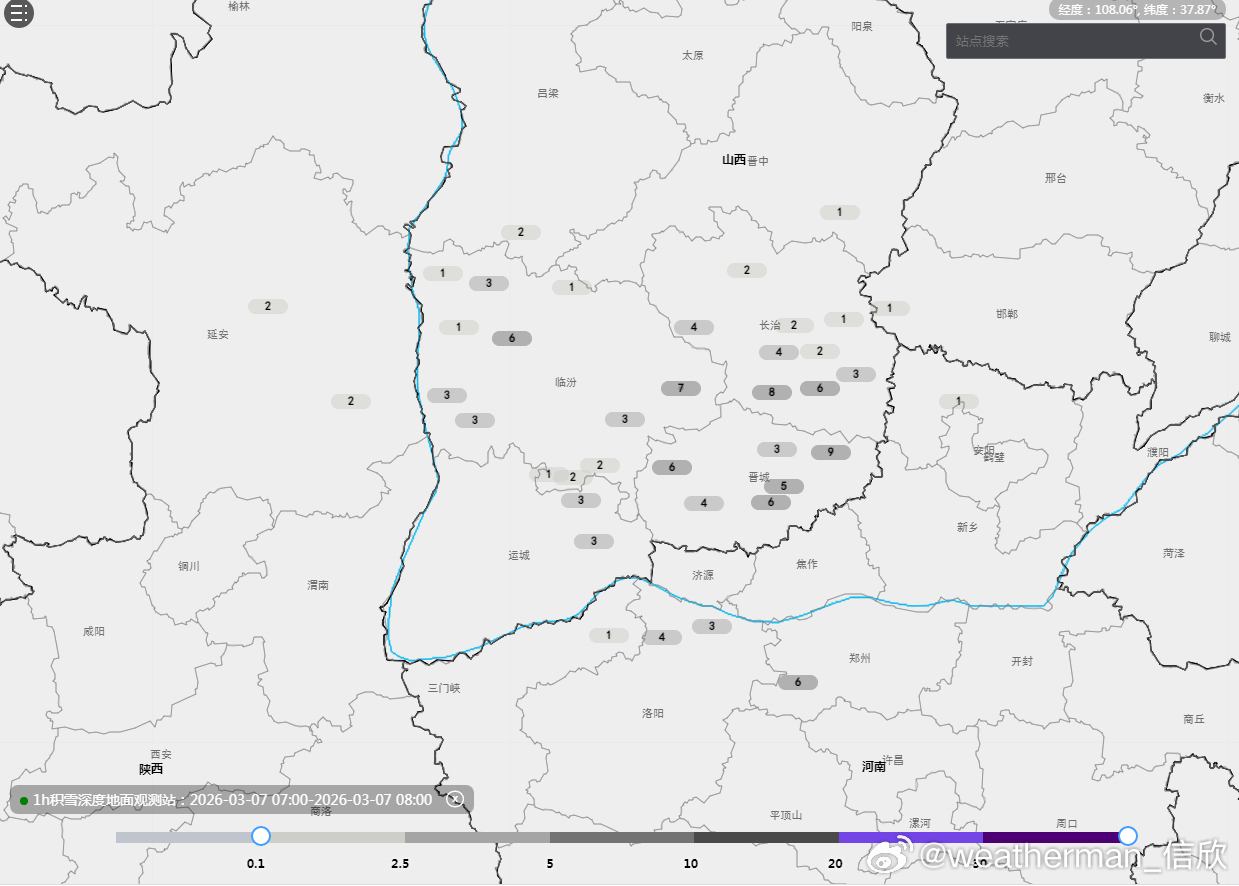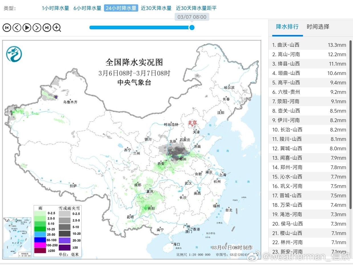 【雨雪】昨天到今晨,陕西中北部、山西南部、河南西北部等地出现降雪或雨转雪。由于降温超预期,降雪比例超预期,形成明显积雪。今晨8时积雪,山西陵川9厘米,长子8厘米,安泽7厘米。此外新疆西部也出现降雪,陕西南部、四川东部、重庆西部、贵州等地出现降雨。