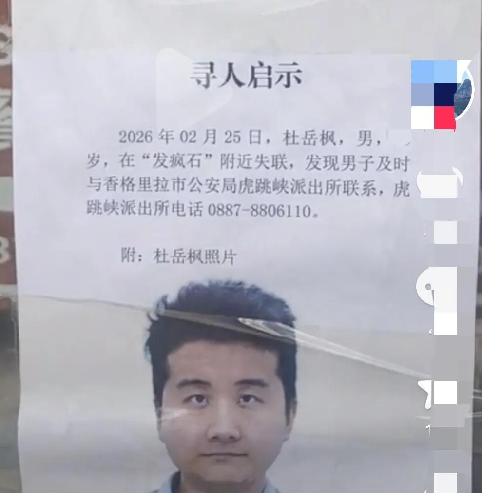 悲痛!这个小伙子叫小杜,1997年生人今年29岁,他就是虎跳峡落水的男子,如今遗体已经被找到。这次与女友去云南旅游行是拍婚纱照的,本想着拍完后顺便游览一下当地的景色,可惜因为失误丢了性命。 2026年,是他跟女友约定结婚的日期。 两人商量去美丽的云南拍摄婚纱照,并约好去当地游玩,他们选择了金沙江虎跳峡。 虎跳峡水域流水湍急,虽然清澈看着不深,实则很危险,人一旦落入水中,很难起身站立,尤其是在有回旋的地方,很难被人发现。 小杜与女友从丽江出发来到虎跳峡,两人有说有笑很是享受旅游的时光。 两人来到“发疯石”处,小杜用江水洗水杯,不幸落入水中。 女友利用登山杖来救小杜,由于水流太急,登山杖断成了两节。向导跳下水想把小杜救上岸,也差点被水冲走。 2月25日事件发生,直至3月6日,10天过去了,救援队才找到小杜,可惜他已经没了生命体征 ,10天里也未曾离开过这片水域。 在他落水不远处,救援队利用水下探头发现了他,为何十天没找到,就是因为他被激流卷进了石头缝中。那处的水比较深且急,小杜被水力吸着,并不容易被发现。 10天里,救援队连下游都找了,还贴了寻人启事,最后还是在水里发现了他。 一个年轻的小伙子,即将走进婚姻的殿堂,将于女友携手一生,就这样失去了鲜活的生命,真的是太可惜了。 这不仅是悲剧也是警示:外出游玩尽量选择安全的地方,尤其是那种开发成熟的地方,不要野游,不要选择危险的地方,生命只有一次,一定要安全第一。 最悲痛的是他的父母吧,家里面把结婚的物品准备妥当,就期盼着他们回家后举办婚礼。三十而立的年纪,却要白发人送黑发人,真的是太悲痛了,希望小杜的家人节哀吧[祈祷][祈祷][祈祷]