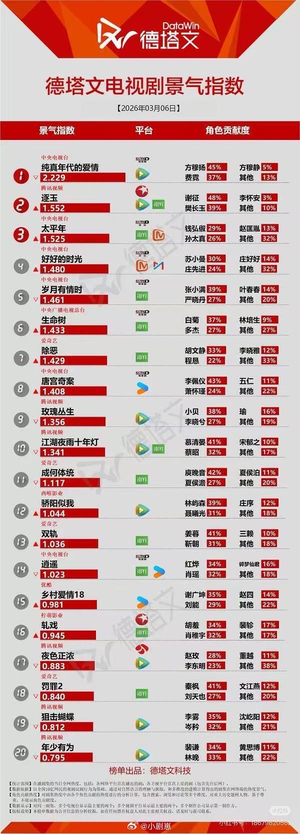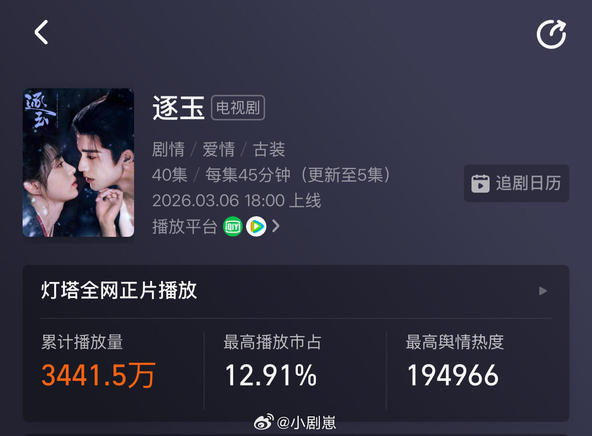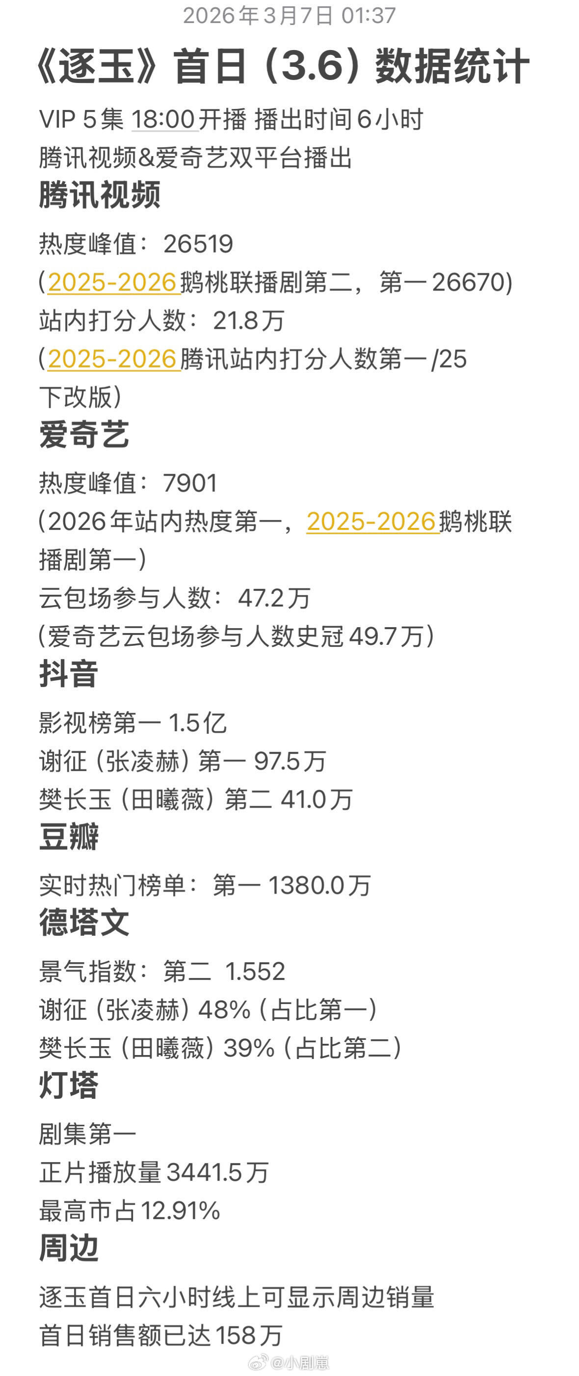 《逐玉》首日(3.6)数据统计一部双平台联播剧播出了腾讯视频独播剧➕爱奇艺独播剧的效果各方面数据全对的上多项数据刷新纪录夯爆了