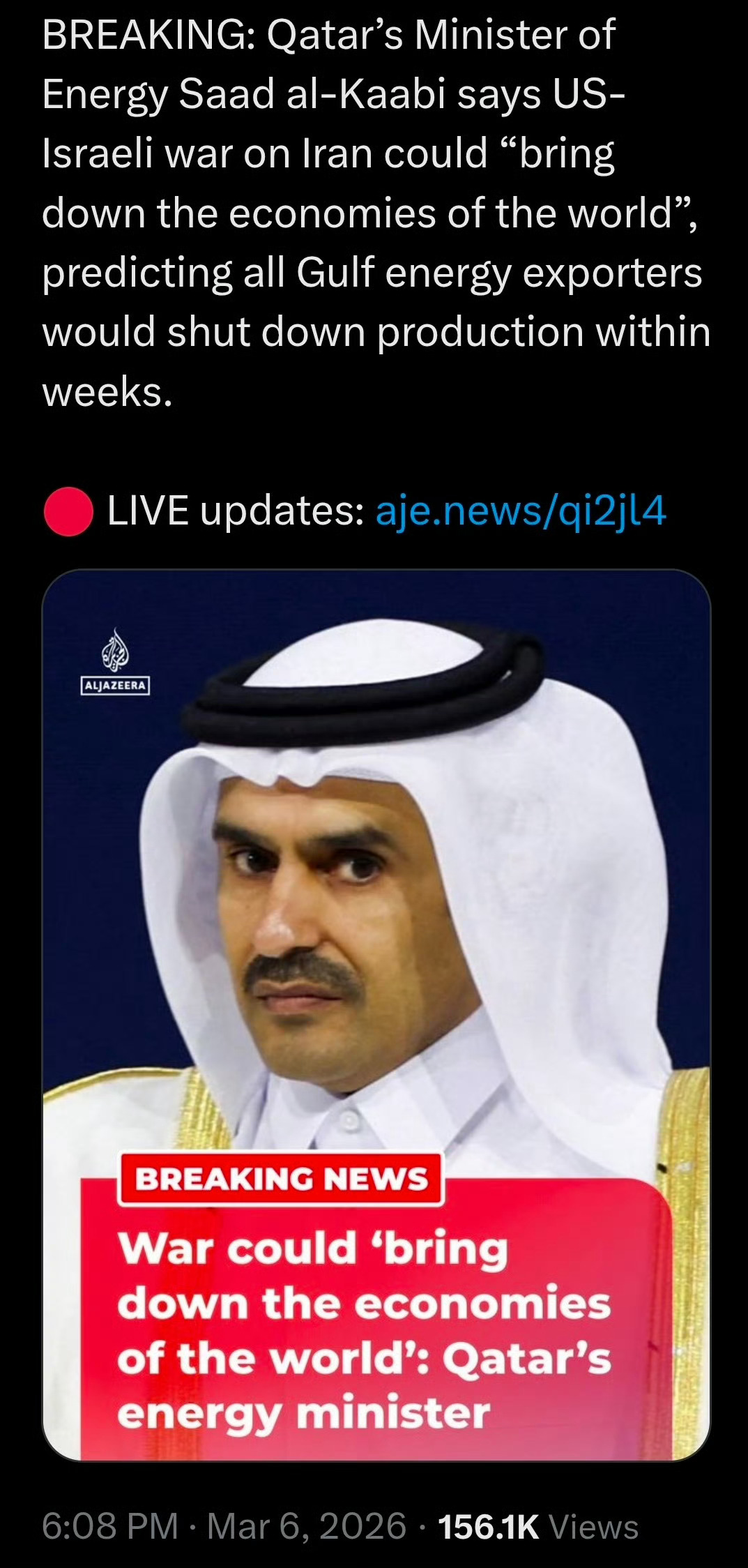 卡塔尔能源部长表示,中东战争可能"拖垮世界经济"。