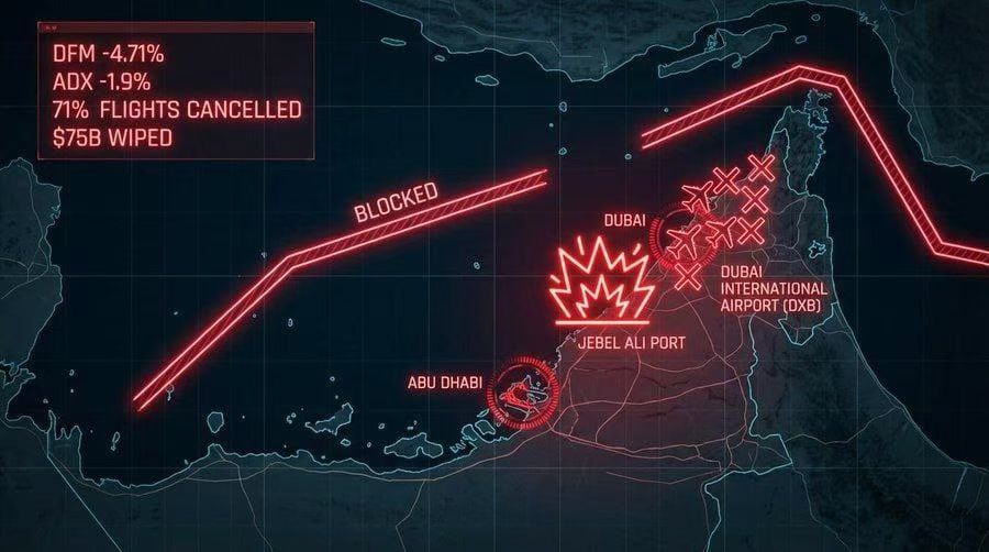 (图一)迪拜金融市场指数两日内下跌10%,为防止全面崩盘, 迪拜金融市场的熔断机制已下调至-5%,伊玛尔地产股两日内下跌10%,酋长国迪拜国民银行股下跌10%,阿联酋48小时内蒸发750-770亿美元市场财富,中东最大港口杰贝阿里港因伊朗导弹碎片引发火灾后关闭。伊朗发动打击后, 阿联酋超市货架被抢购一空,阿联酋80%以上的食品依赖进口,如今供应链中断, 出现恐慌性抢购,购物者排起长队,食品配送延误。阿联酋规定: 发布关于危机的帖子, 将被处以54000美元罚款加一年监禁。传播"来源不明"的视频片段,将面临立即被捕的风险,迪拜网红被直接警告要求保持沉默,政府呼吁所有人不要恐慌。