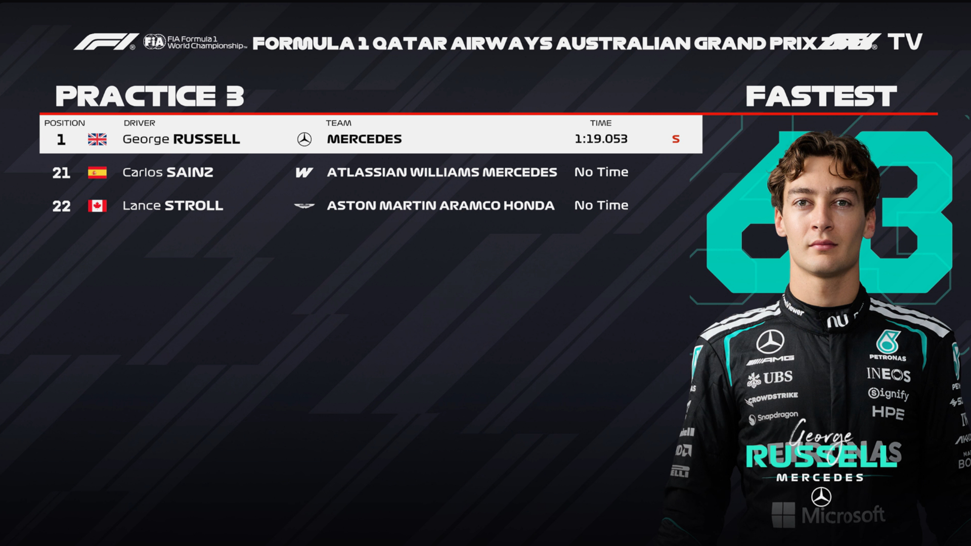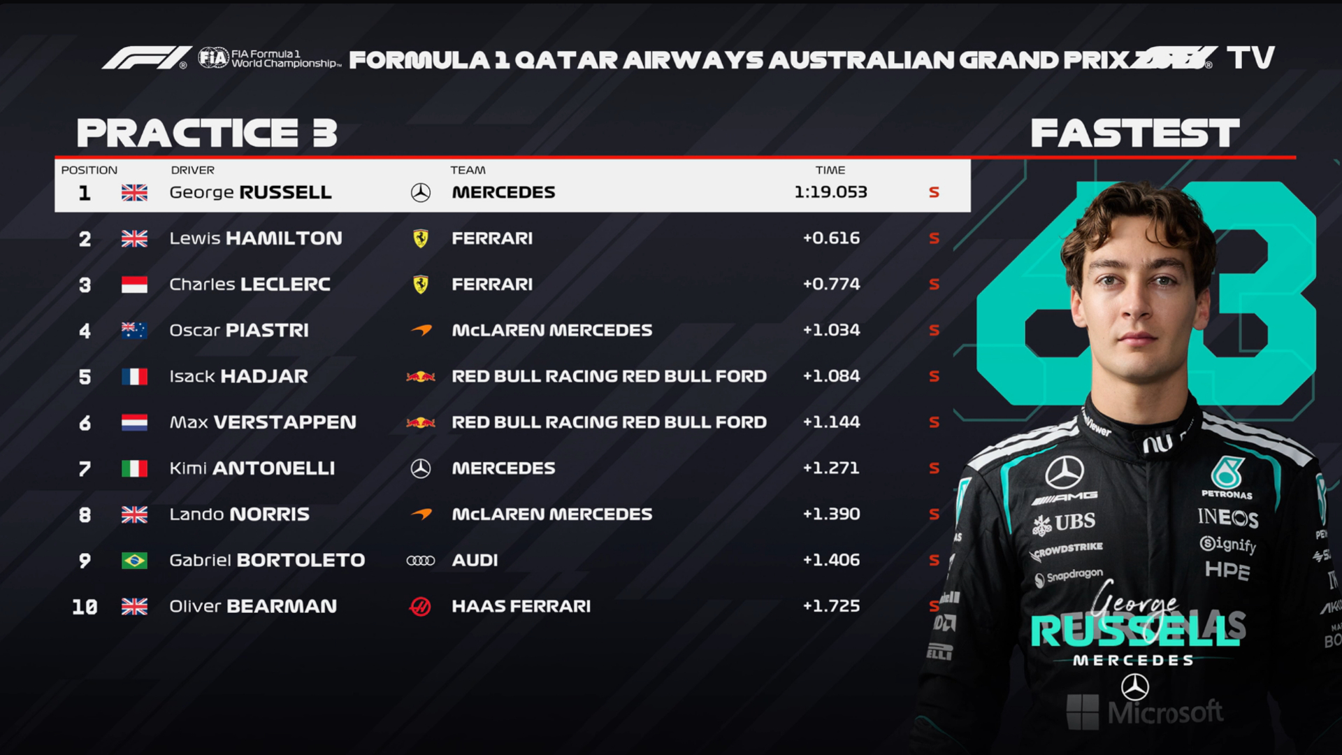 澳大利亚站FP3成绩:拉塞尔领先超过0.6秒,法拉利2-3
