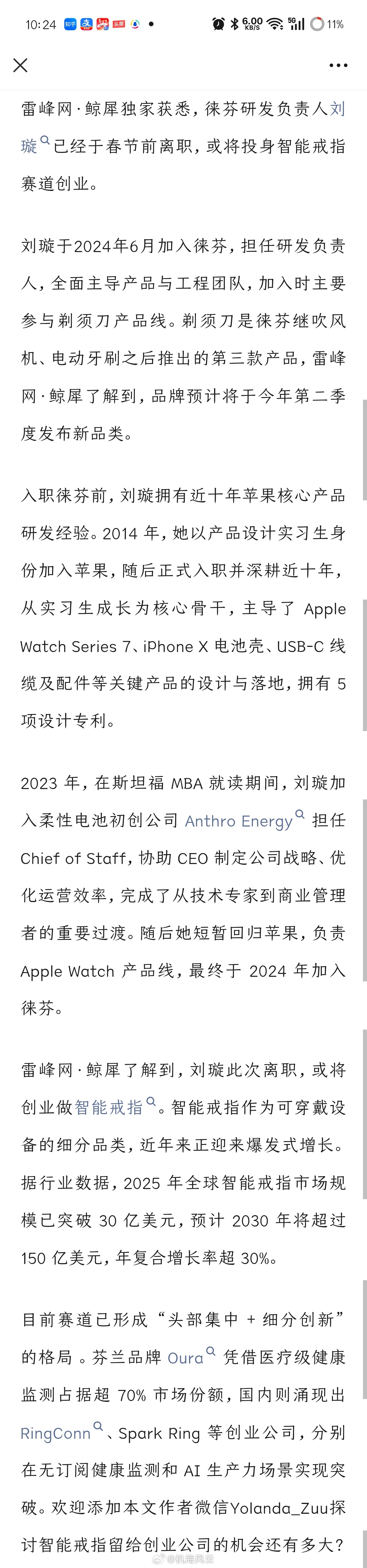 《独家丨徕芬研发负责人刘璇离职,或创业做智能戒指💍》——鲸犀
