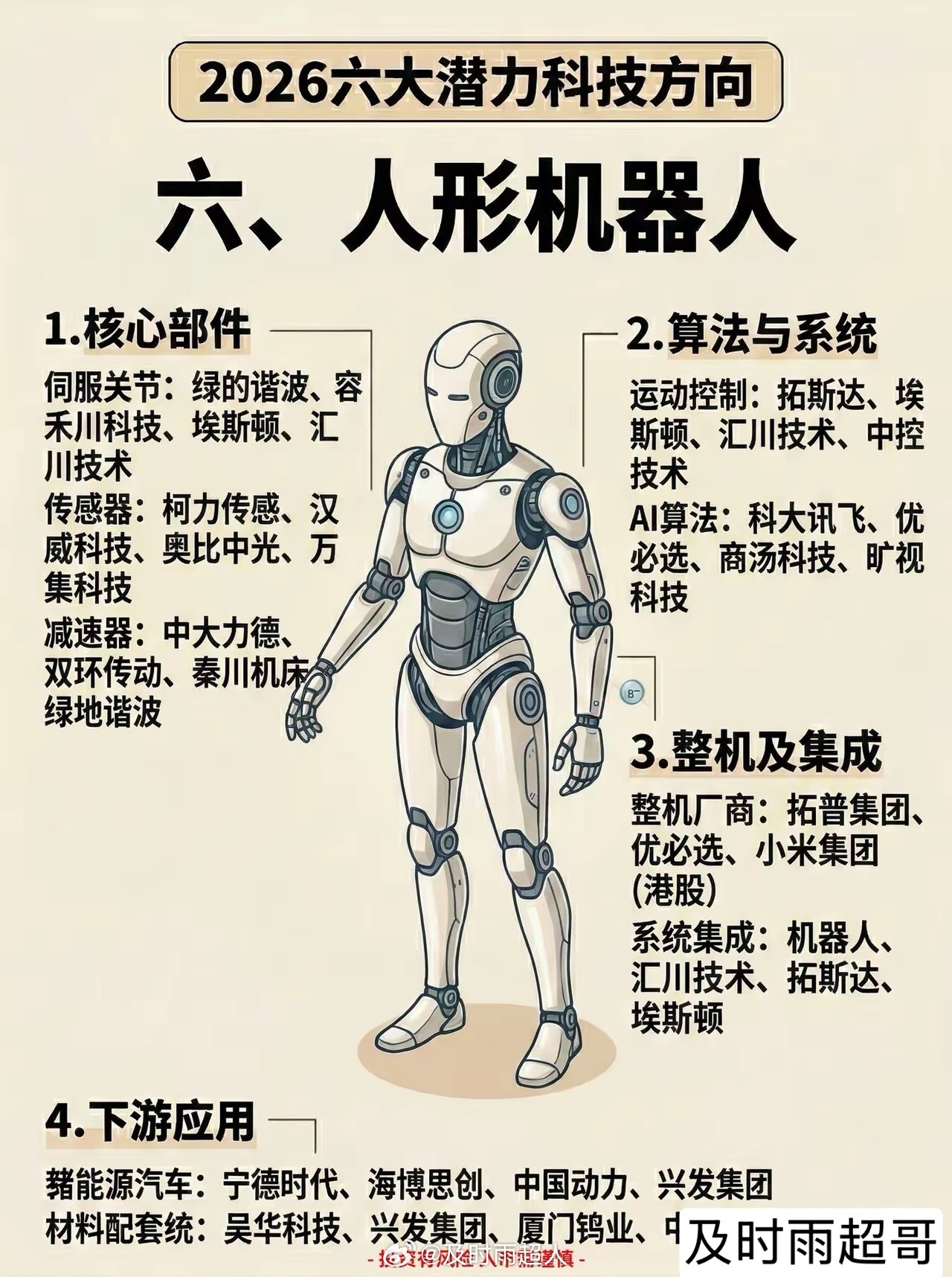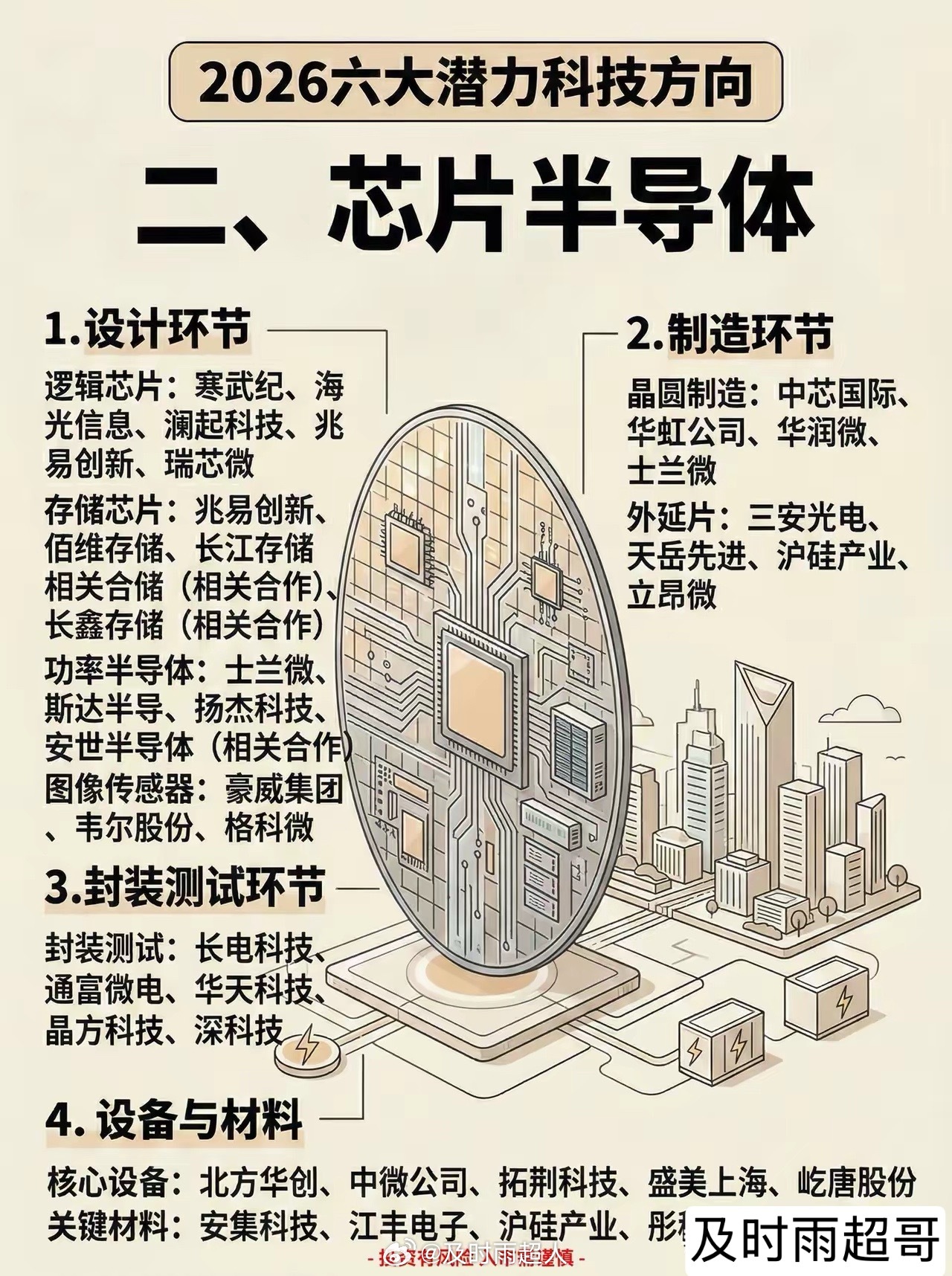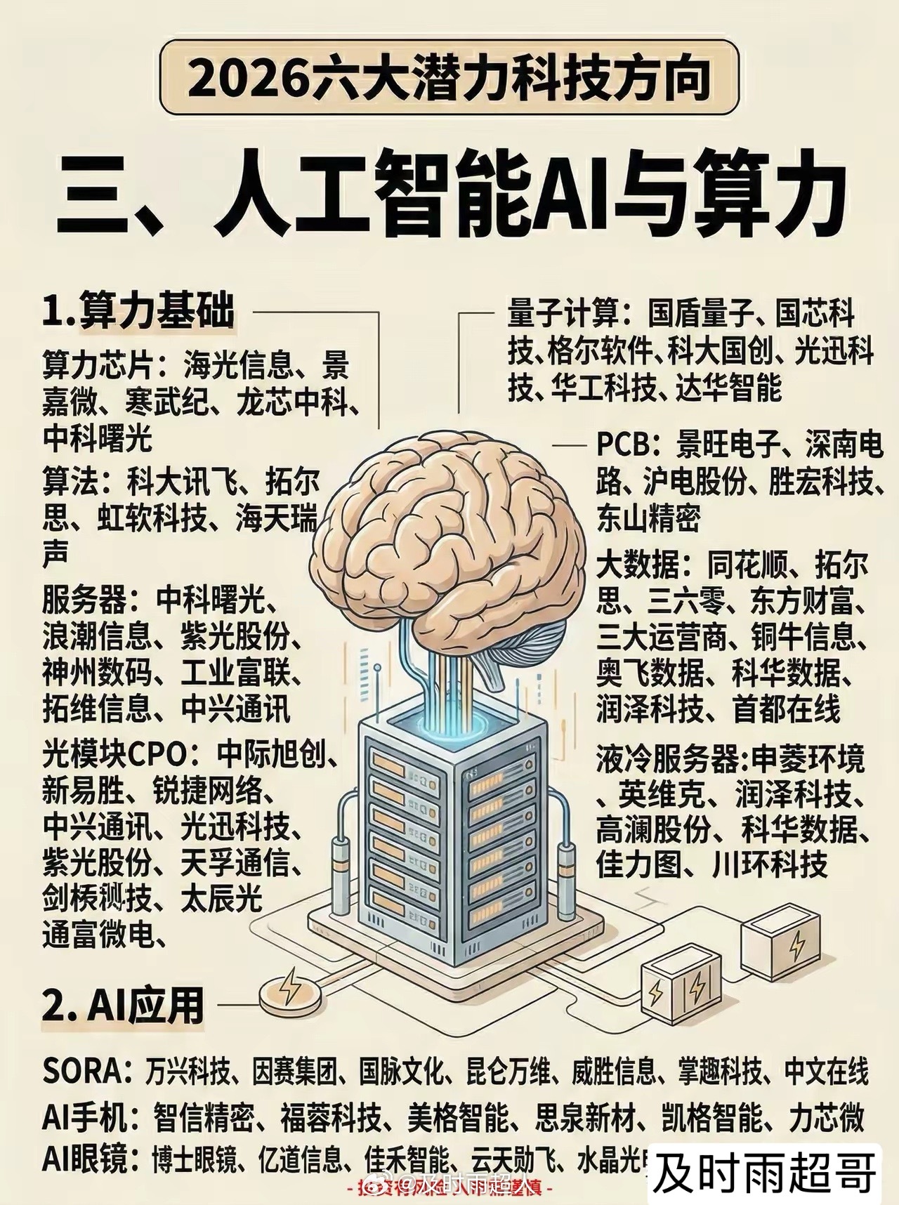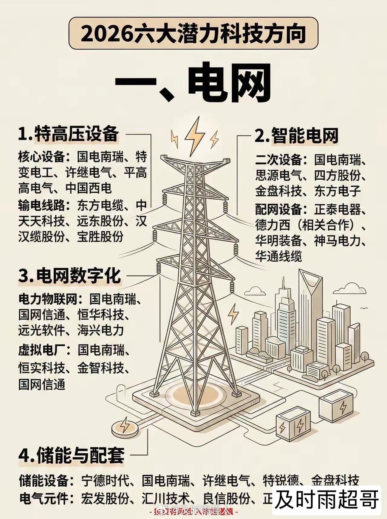 短期调整不改长期趋势,六大科技赛道掘金正当时近期市场波动加剧,科技板块出现阶段性调整,但这并未动摇其作为未来发展核心驱动力的地位。从电网升级到半导体自主可控,从AI算力到人形机器人,六大科技赛道的长期成长逻辑清晰,短期回调恰恰为价值投资者提供了布局窗口。电网作为新型能源体系的“骨架”,正迎来特高压、智能电网与储能配套的三重升级。国电南瑞、许继电气等核心设备商受益于特高压建设提速,而宁德时代、正泰电器则在储能与电气元件领域占据先发优势。在“双碳”目标下,电网数字化与虚拟电厂的推进,将持续释放行业增长空间。半导体是科技自立自强的关键。设计环节中,寒武纪、海光信息在算力芯片领域突破不断;制造环节,中芯国际、华虹公司推动晶圆产能爬坡;封装测试领域,长电科技、通富微电持续提升先进封装技术。北方华创、中微公司等设备商则为国产替代提供核心支撑,全产业链协同发展的格局正在形成。AI与算力是数字经济的“引擎”。算力芯片领域,海光信息、中科曙光构建起国产算力底座;SORA、AI手机等应用场景的爆发,带动万兴科技、智信精密等企业快速成长。液冷服务器、光模块CPO等基础设施的完善,将进一步释放AI产业的增长潜力。无人驾驶、固态电池与人形机器人则代表着未来出行与制造的变革方向。禾赛科技、德赛西威在感知与决策层占据优势,宁德时代、海博思创推动固态电池商业化落地,拓普集团、优必选则在人形机器人整机集成领域加速布局。短期市场调整是风险释放的过程,更是筛选优质标的的契机。投资者应聚焦具备核心技术、产能优势与明确应用场景的企业,在回调中分批布局,等待产业趋势兑现。风险提示:投资有风险,入市需谨慎。行业政策、技术迭代及市场波动均可能影响相关企业表现,本文内容仅供参考,不构成投资建议。