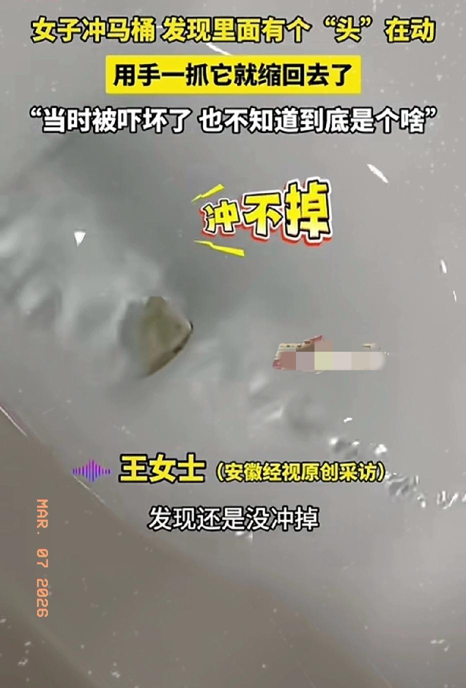 近日黑龙江伊春,一30岁女子上厕所冲水时,低头一看差点没吓晕过去!马桶里竟然有个“头”在动!她下意识伸手一抓,那东西竟然缩回去了! 女子说,当时上完厕所正常冲水,余光扫到马桶里有个东西在动。定睛一看,吓得头皮发麻——一个青青色、三角形,像“头”一样的东西,正随着水流蠕动! 她也不知道哪来的勇气,伸手就去抓,结果手刚碰到,那东西“嗖”一下就缩进下水道里不见了!女子当场懵了:这到底是个啥?是老鼠?是蛇?还是别的什么? 事后她越想越后怕,上网发帖求助,网友评论区直接炸锅:有人说是大耗子,有人说是黄鳝,还有人说可能是下水道里养的“那种东西”……更有人调侃:不管它是啥,你伸手抓的那一下,你是真勇! 你觉得马桶里那个“头”会是啥?你上厕所遇到过什么奇怪的东西吗?