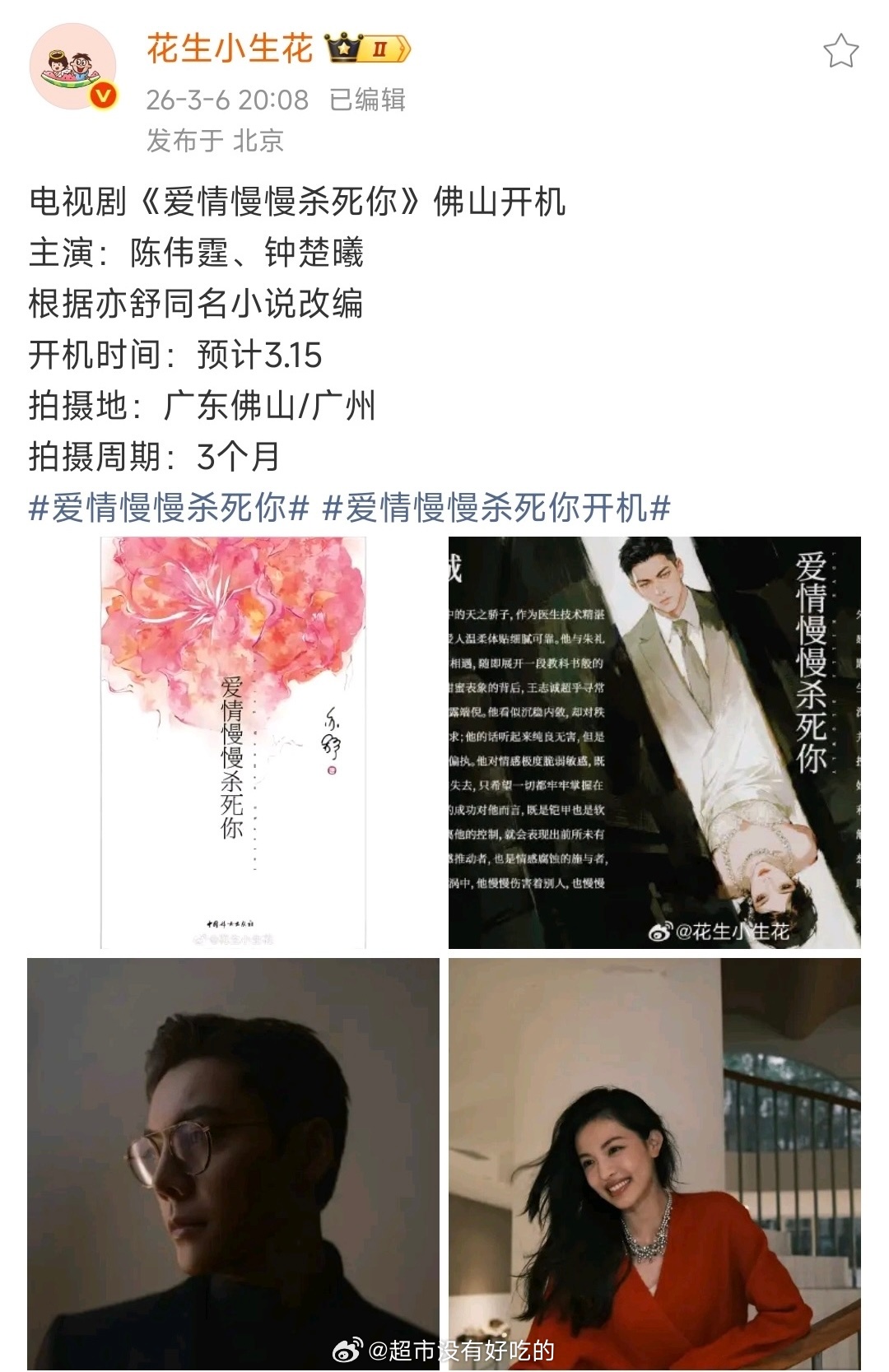 电视剧《爱情慢慢杀死你》佛山开机主演:陈伟霆、钟楚曦根据亦舒同名小说改编开机时间:预计3.15拍摄地:广东佛山/广州拍摄周期:3个月爱情慢慢杀死你开机 陈伟霆爱情慢慢杀死你