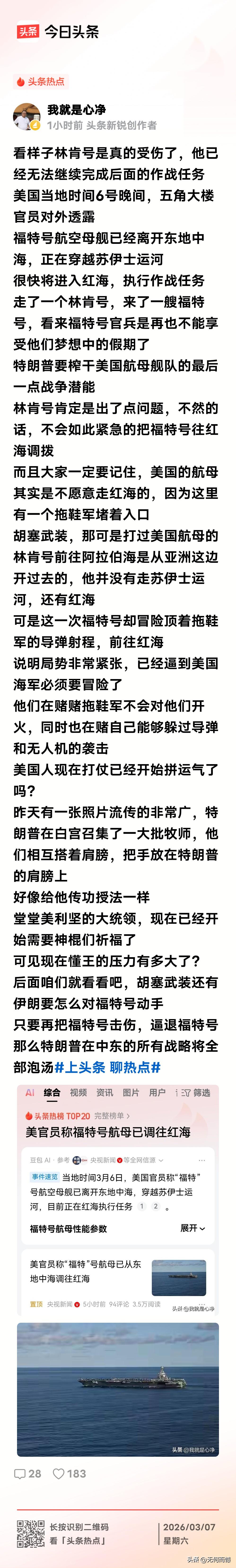 林肯号航母十有八九是被击中了,尽管美方现在嘴还比较硬,没有公布真实情况,但是他们的一些做法还是比较诚实的,直接就暴露了林肯号航母不能参加战斗的真实处境,否则的话,福特号航母也不可能冒险走红海,这里面的真实意图是显而易见的!