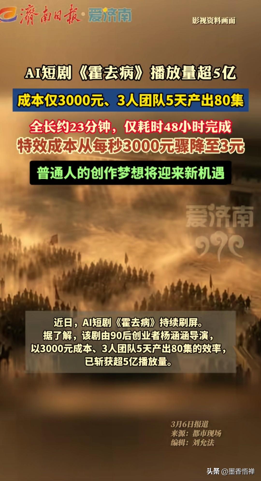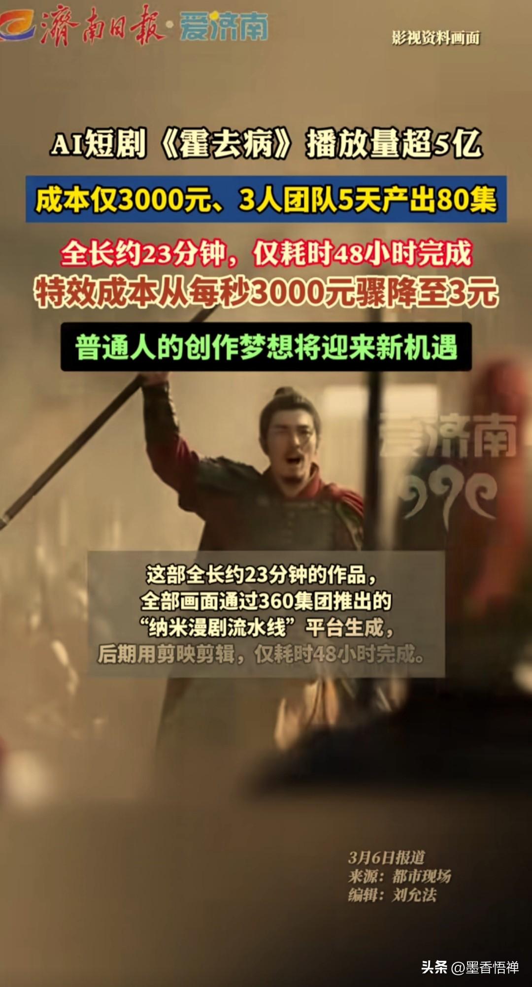 3000元成本、5亿播放!AI短剧《霍去病》炸翻全网,普通人也能拍爆款了 最近一部AI短剧彻底火出圈了,3个人的团队,5天就拍出了80集,总成本仅3000元,全球播放量狂破5亿,连海外网友都在追。 没有演员、没有场地、没有服化道,全靠AI生成画面与配音。传统特效一秒3000元,这部剧直接压到每秒3元,千军万马、大漠沙场、电影级质感随手就来。 以后普通人也可以创作史诗级大片了,只要你题材选的好,技术过硬,也能做出大片了。 以前拍电影动不动投资几个亿,甚至十几亿,还要租场地、请演员、后期做特效、配音。现在几个人的团队,利用AI工具,一台电脑就能搞定了。 这次短剧《霍去病》的爆火,不是行业的末日,而是普通人的入场券。以前你有梦想,灵感和想象力,但是没有资本和资源,根本就进不了影视圈,现在只要你敢想,会利用AI工具,也能做出自己想要的爆款大片。