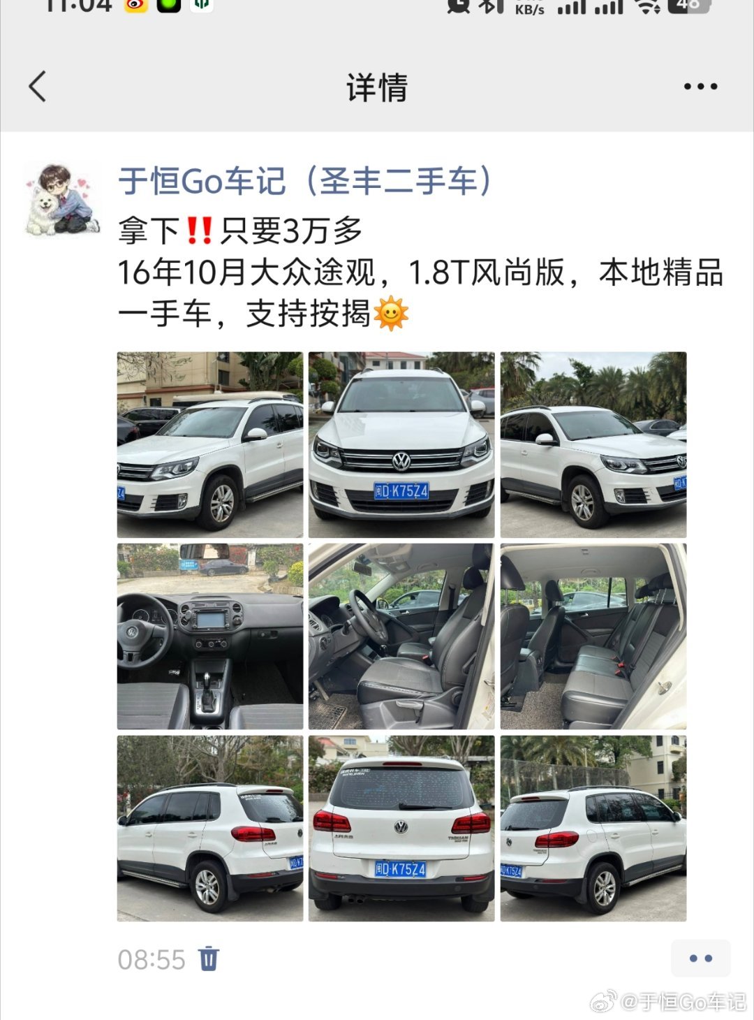 2万多从车主手上收来的途观,朋友圈发卖3万多,车主看到会跳起来,但是他没看到的是,这车回来发动机修了3200,内饰修了800,再加上洗车、过户、缴税,大概5000多就去了,成本直逼2万大块3万。于恒的二手车日常