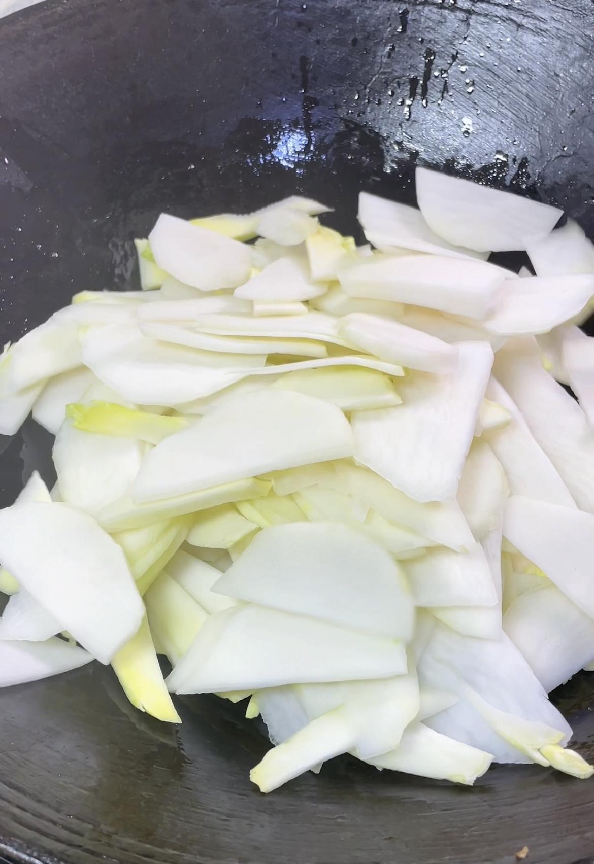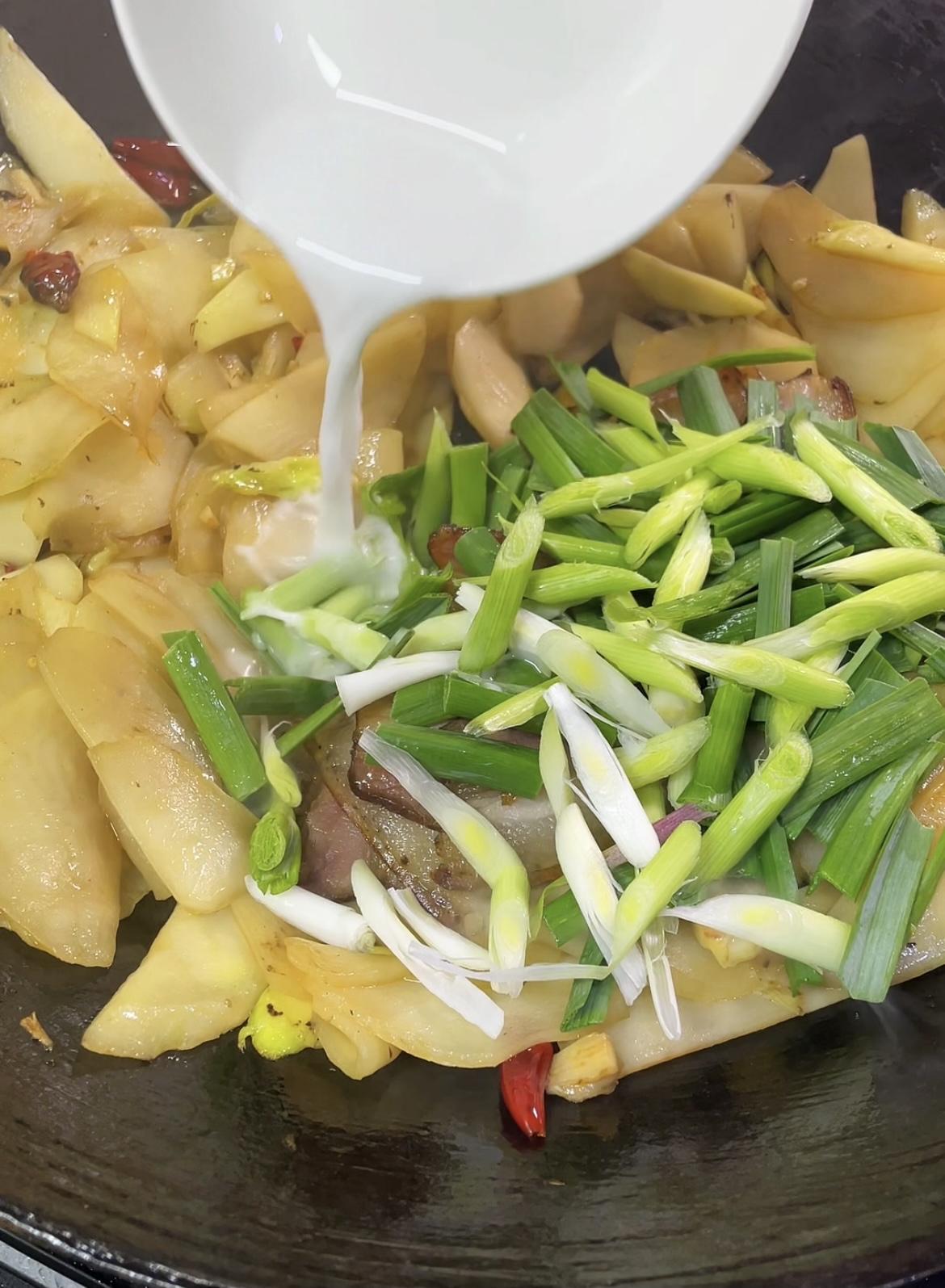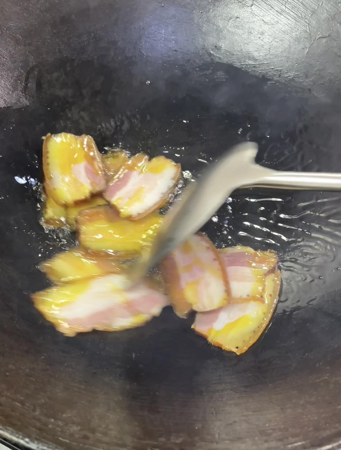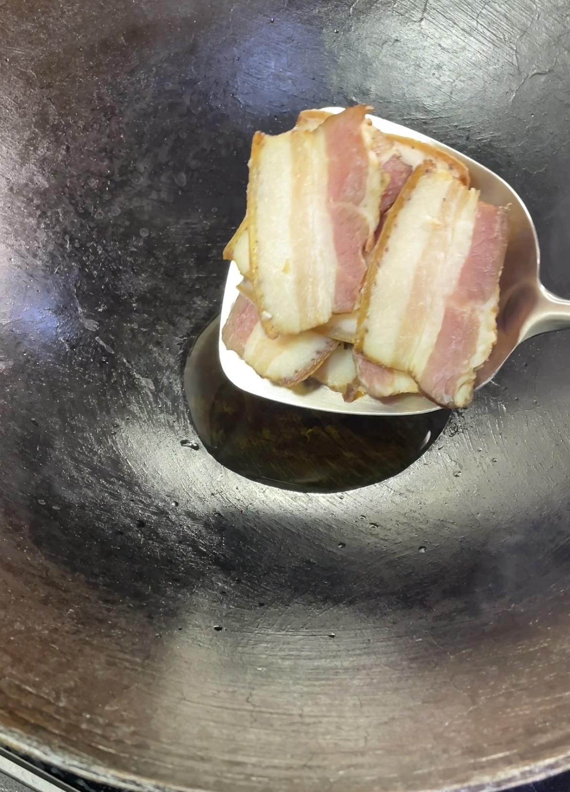 两颗青菜头+几片腊肉就能搞定的美食! 锅里油适量,适量来点腊肉。 中火炒出油脂。 炒成这种干干的样子盛出备用。 锅里留底油,放蒜末小米椒。 翻炒香后倒入青菜头。 青菜头翻炒几十秒后加盐、生抽调味。 大火翻炒熟透后,起锅前倒入腊肉,灵魂蒜苗。 加一点淀粉水吃着会更加爽滑。 继续翻炒几十秒就可以出锅啦! 非常好吃的一道家常菜,快动手试试吧!