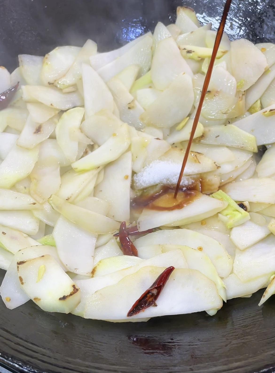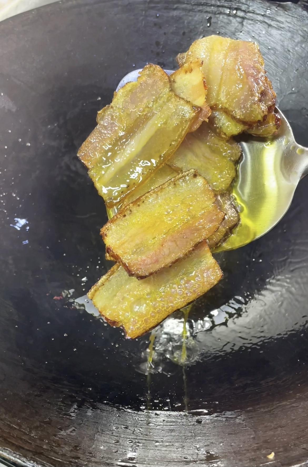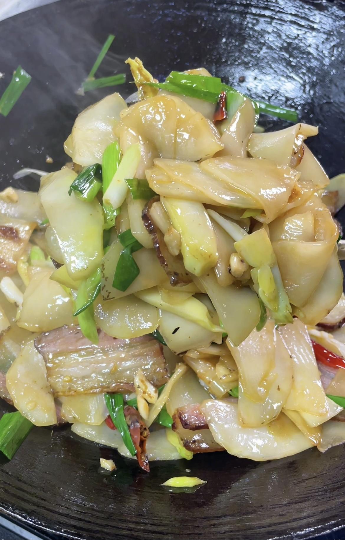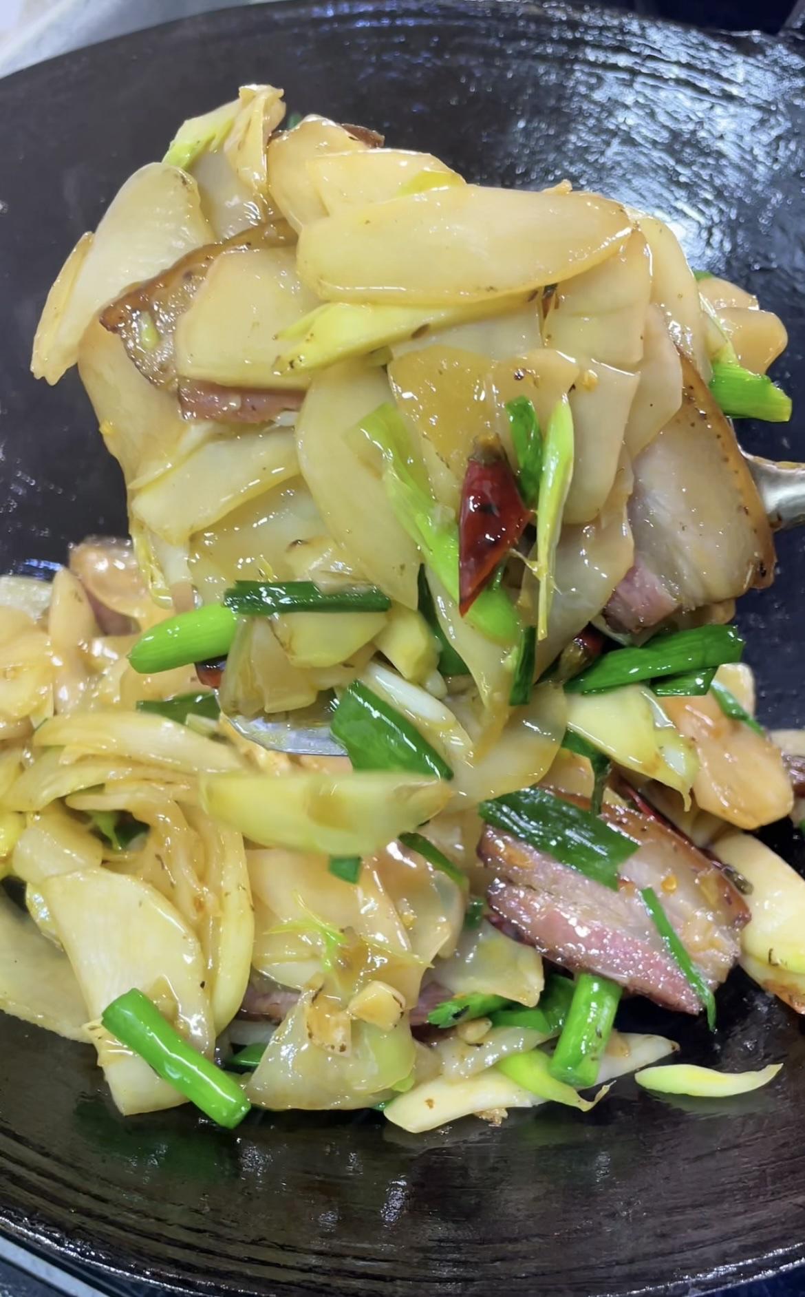 两颗青菜头+几片腊肉就能搞定的美食! 锅里油适量,适量来点腊肉。 中火炒出油脂。 炒成这种干干的样子盛出备用。 锅里留底油,放蒜末小米椒。 翻炒香后倒入青菜头。 青菜头翻炒几十秒后加盐、生抽调味。 大火翻炒熟透后,起锅前倒入腊肉,灵魂蒜苗。 加一点淀粉水吃着会更加爽滑。 继续翻炒几十秒就可以出锅啦! 非常好吃的一道家常菜,快动手试试吧!