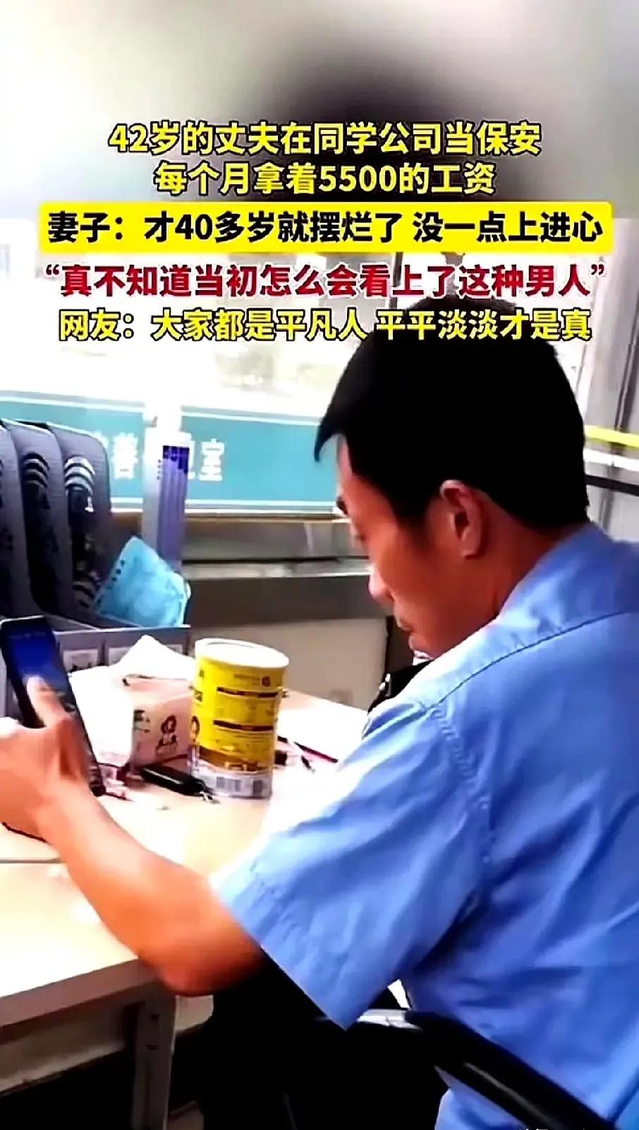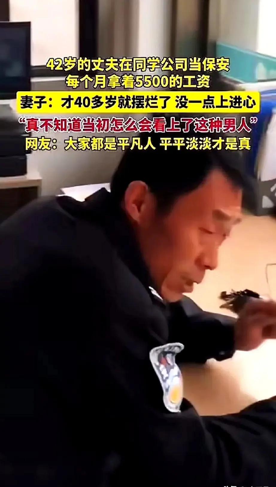 女子吐槽自己的老公,今年才42岁,年纪轻轻本该是为家庭拼搏的时候他却选择了躺平。选择在同学公司做保安,每个月领5500元工资,他同学承诺他,只要公司不倒闭,他就不担心被辞退的问题。女子不是怪他不上班,而是怪他没有上进心,才四十多岁就摆烂了,怪自己当初是瞎了狗眼才看上他。 这话听着扎心,却藏着不少家庭的真实矛盾。在同学公司当保安,听着确实没那么“体面”,不用熬夜加班,不用应付复杂的职场斗争,每天守好岗位就能拿到稳定的工资,连被辞退的风险都被老同学打包票挡了回去。在妻子眼里,这是“不思进取”,是提前过上了养老生活,可在男人自己心里,或许这是他能给家庭的另一种安稳。 没人不想赚大钱,可42岁的年纪,早过了可以随意试错的阶段。上有老人要赡养,下有孩子要读书,每一步选择都牵着整个家的生计。贸然辞掉稳定的工作去闯事业,成功了还好,一旦失败,整个家庭都要跟着陷入困境。他选择这份看似“没前途”的工作,或许不是不想拼,而是不敢再拿家人的生活去赌。 妻子的愤怒也能理解,谁都盼着日子能越过越好,盼着丈夫能更有出息,能让自己和孩子过上更宽裕的生活。可“上进心”从来没有统一的标准,不是只有挤破头往高处爬才叫努力,守好一份安稳的工作,把家里的日子打理得井井有条,也是一种负责任的担当。 我们总被“三十而立、四十不惑”的焦虑推着走,好像到了某个年纪就必须要功成名就,否则就是“摆烂”。可大多数人终其一生,都是在平凡的岗位上默默付出,用微薄的工资撑起一个家。5500块或许不多,但也是他每天按时到岗、认真值守换来的,这份踏实,不该被轻易否定。 这件事在网上也吵翻了天,有人站妻子,也有人心疼丈夫。有人说“42岁还能有稳定工作就不错了,现在就业环境这么难,敢闯的都是家里有底气的,普通人求安稳没毛病”,也有人反驳“妻子要的不是大富大贵,是看到男人愿意为家努力的样子,现在直接躺平,换谁都会失望”。还有人劝“夫妻之间别只看表面,坐下来好好聊聊,说不定他有自己的难处,互相体谅才是过日子的根本”,更有人感慨“大家都是平凡人,平平淡淡才是真,没必要用世俗的成功标准绑架彼此”。 各位读者你们怎么看?欢迎在评论区讨论。