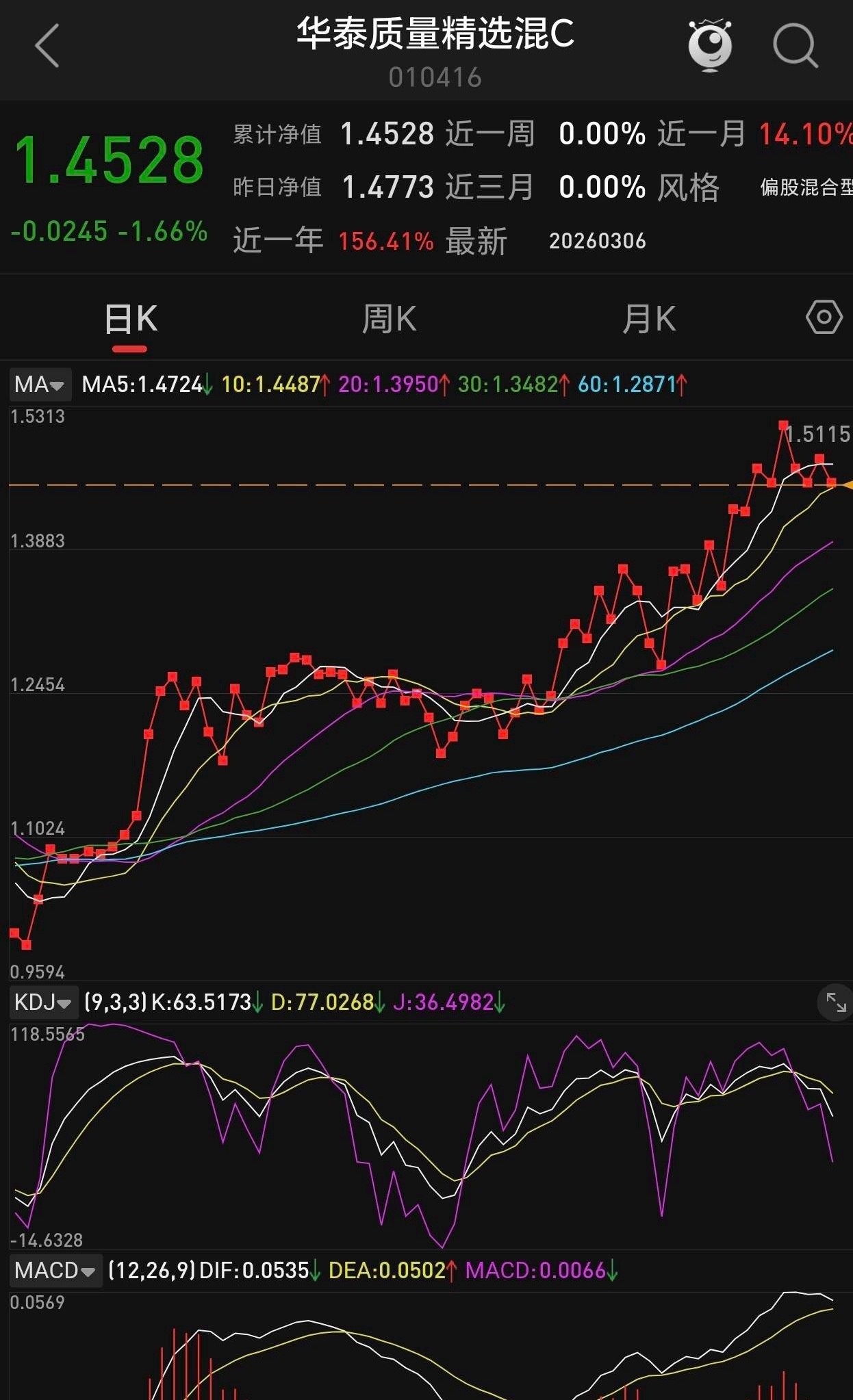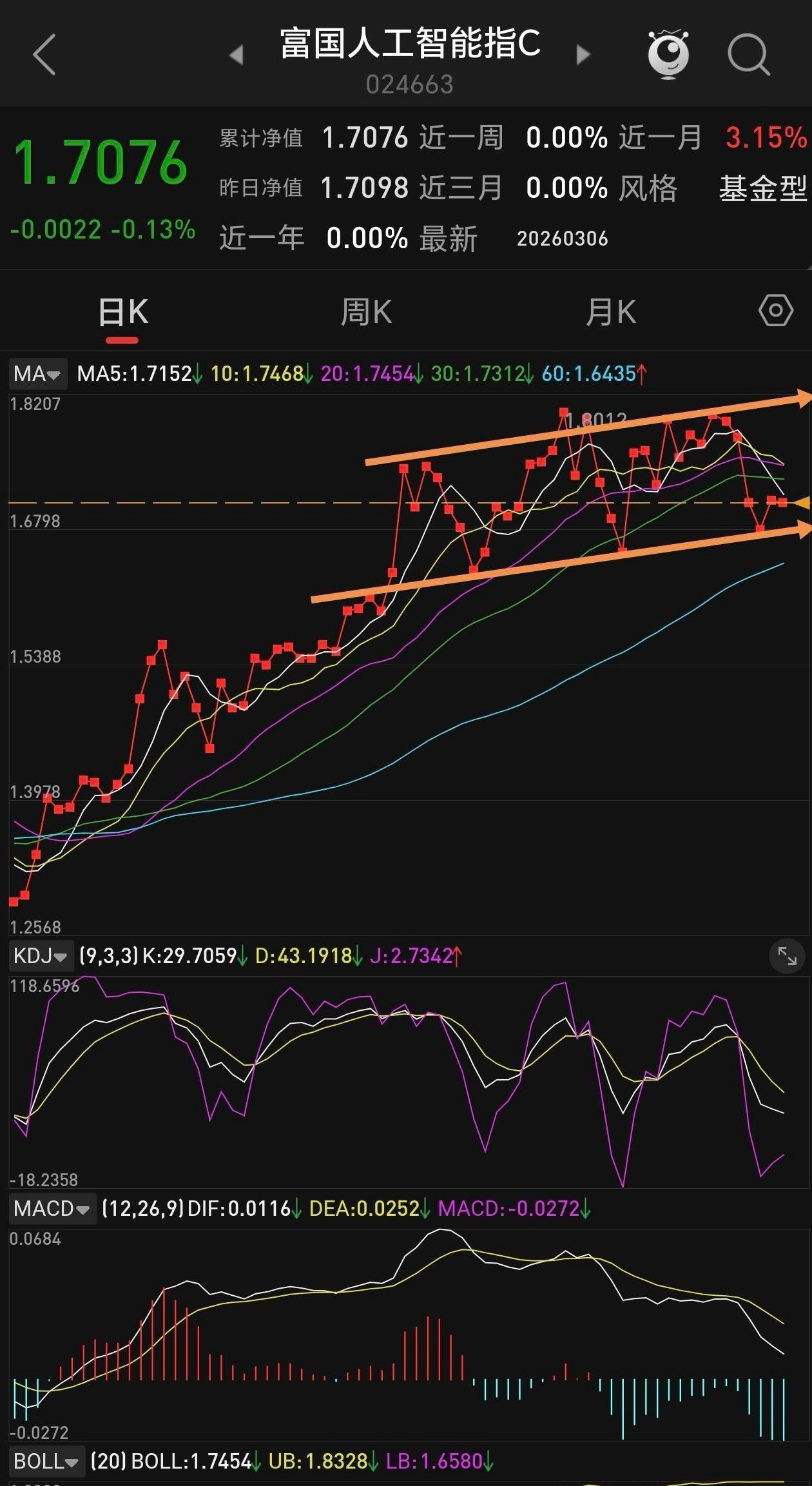 富国创业板人工智能与华泰质量精选,持仓股票基本上是属于同类型板块,一个是跟踪人工智能指数,一个是cpo混合型基金,但是,业绩不如cpo好。 富国创业板人工智能日线走势如下图所示,它短线只能做高抛低吸,否则来回坐山车,规律是从低点到高点大约7--8天。 华泰质量精选属于cpo基金,业绩表现不错,近期基本上是沿着10日线上行,前期回调规律是20日线支撑,很少跌破30日线支撑,所以等它回调到20日线支撑就可以买进。目前距离20日线支撑有4%,距30日线支撑7%,30日线回撤幅度有点大,分期逢跌买入比较合适,密切观察其走势。 经过年后运行来看,cpo赛道还是比较抗跌,涨多跌少,虽然位置比较高。