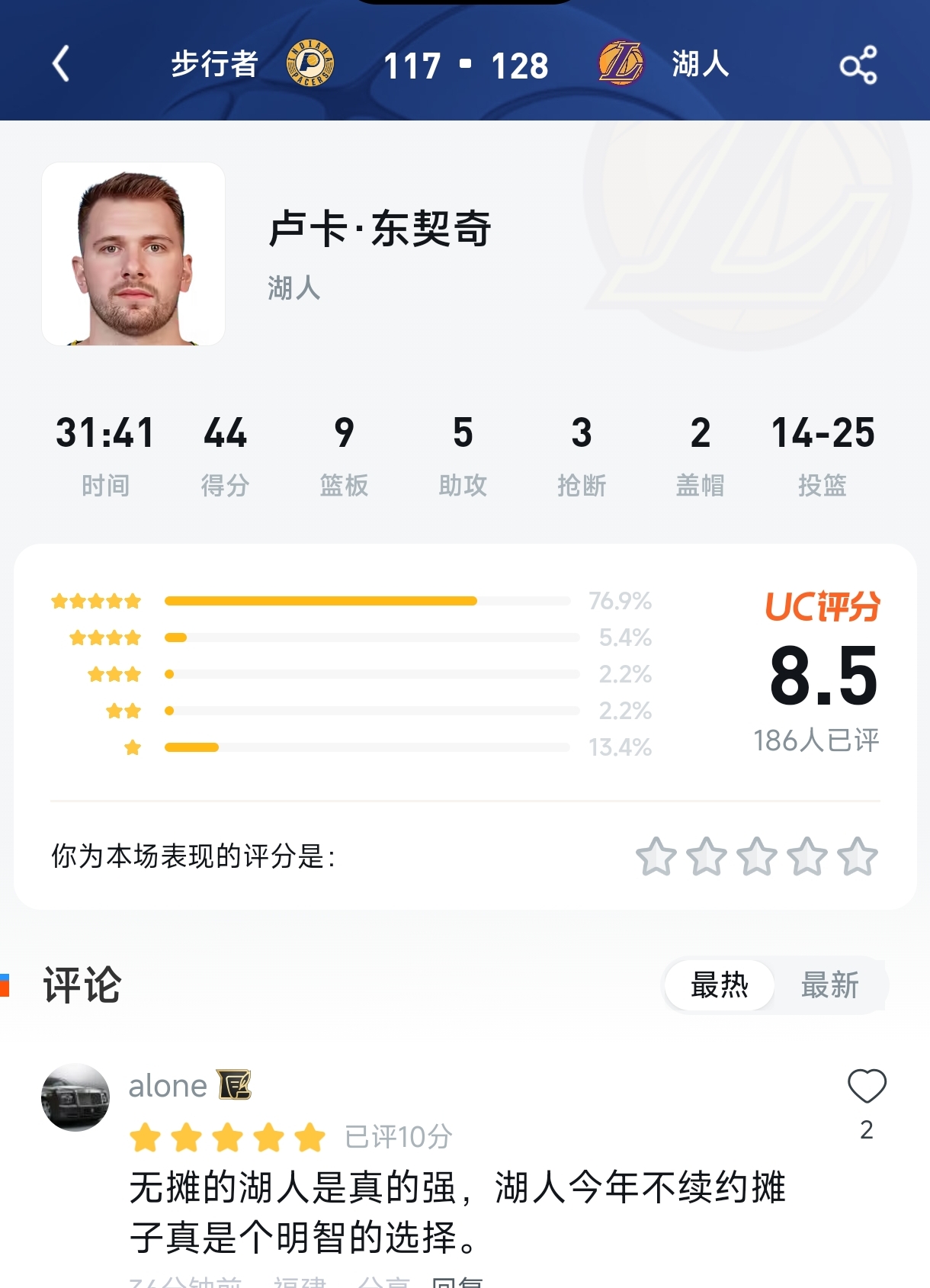 如果你错过了直播,没关系,但请你一定要看看赛后的球员评分区——那里面上演的戏码,甚至比比赛本身还要精彩。 球员: 卢卡·东契奇(湖人) 评分:8.5分(186人已评) 评分分布: 五星:76.9% 四星:5.4% 三星:2.2% 二星:2.2% 一星:13.4%