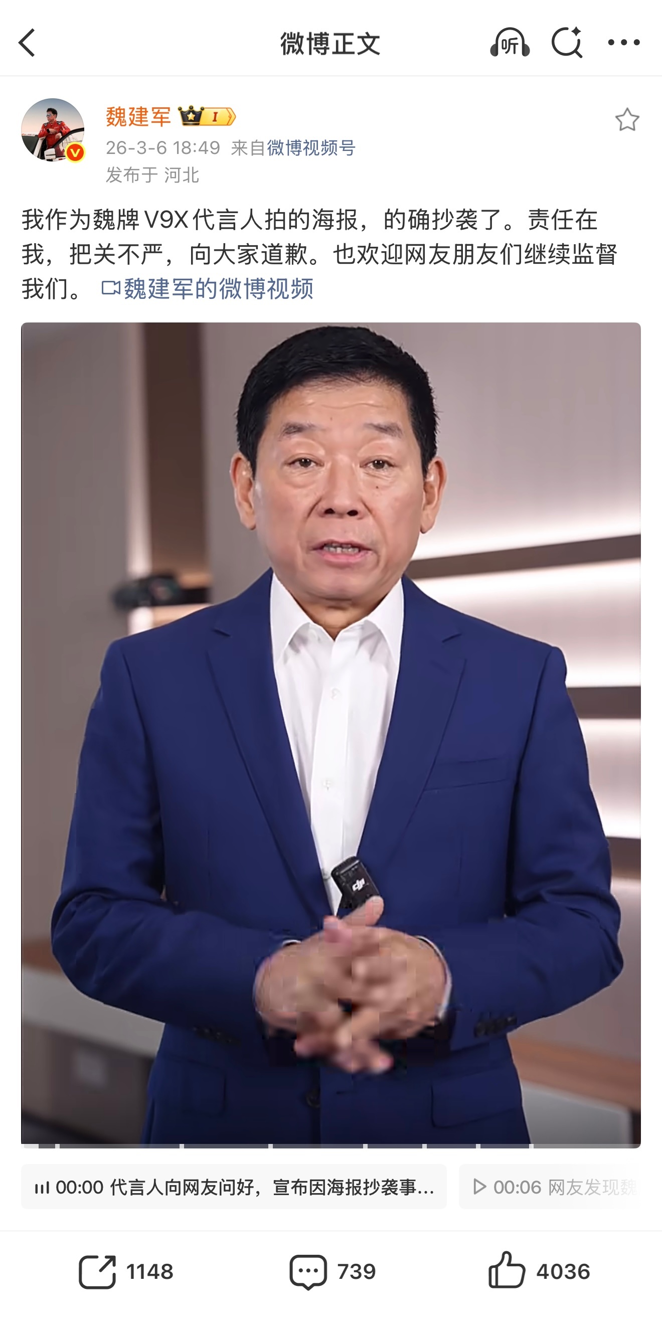 微博上信息显示:长城汽车董事长魏建军代言V9X海报被投诉抄袭路虎。原作:该创意是