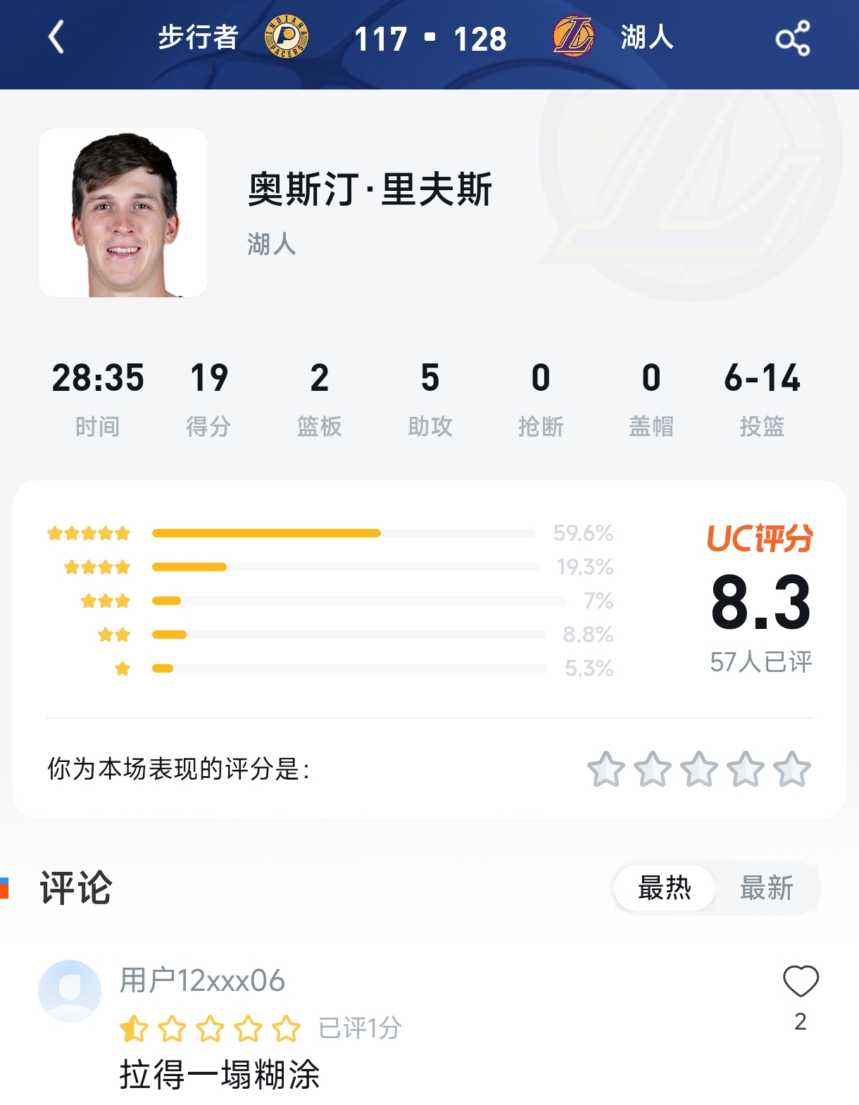 球员: 奥斯汀·里夫斯(湖人) 评分: 8.3分(57人已评) 评分分布: 五星:59.6% 四星:19.3% 三星:7% 二星:8.8% 一星:5.3% 热门用户评论: 用户12xxx06(已评1分): “拉得一塌糊涂” 被“开会”的半场,被忽略的全局 说实话,打出这样的评分分布,恰恰说明了里夫斯现在的“看球费”属性。