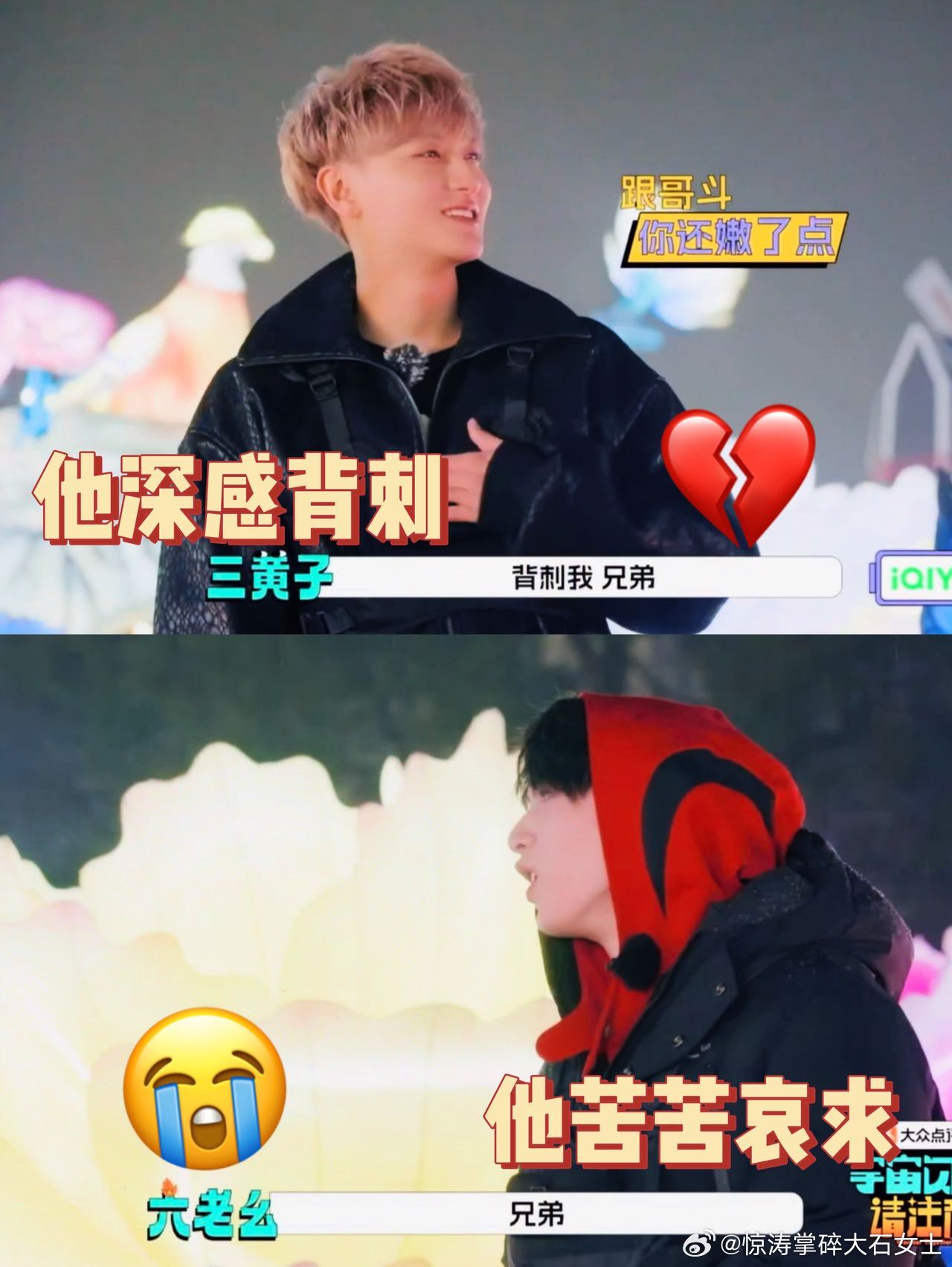 这回换刘耀文哄黄子韬了 刘耀文黄子韬结盟破裂,小刘拍了哥哥一下,现在只能一口一个bro哄回黄子韬。