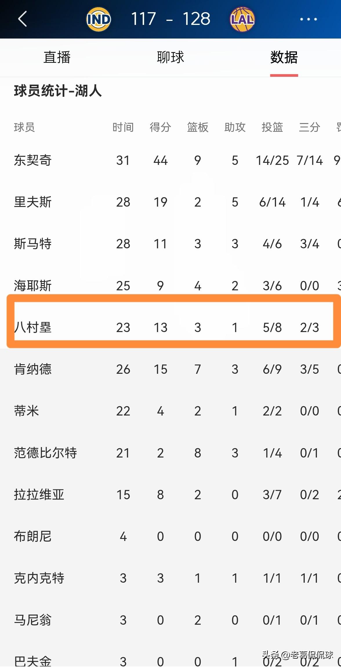湖人大将八村塁的状态真是越来越好了!在今天湖人主场以128:117击败步行者的比赛中,八村塁延续了昨天对阵掘金时的出色手感,他在首发出战的23分钟里,投篮8中5,其中三分球3中2、罚球1中1非常高效的得到13分,还有3篮板1助攻他的场上正负值为+6。 随着八村塁进攻状态的复苏,湖人的进攻体系变得更加丰富多样了。即便詹姆斯因伤缺阵,湖人仍然能够打出非常精彩的团队配合。