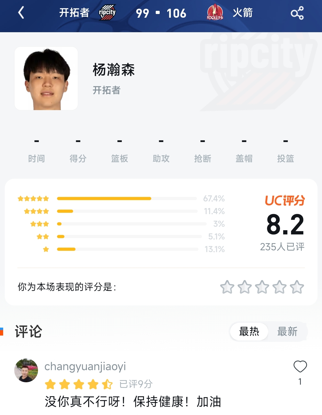 今天开拓者客场挑战火箭,虽然最终以99-106惜败,但在赛后的评分区,却出现了一个让所有没看球的人一脸问号的景象——中国球员杨瀚森的评分区炸了!