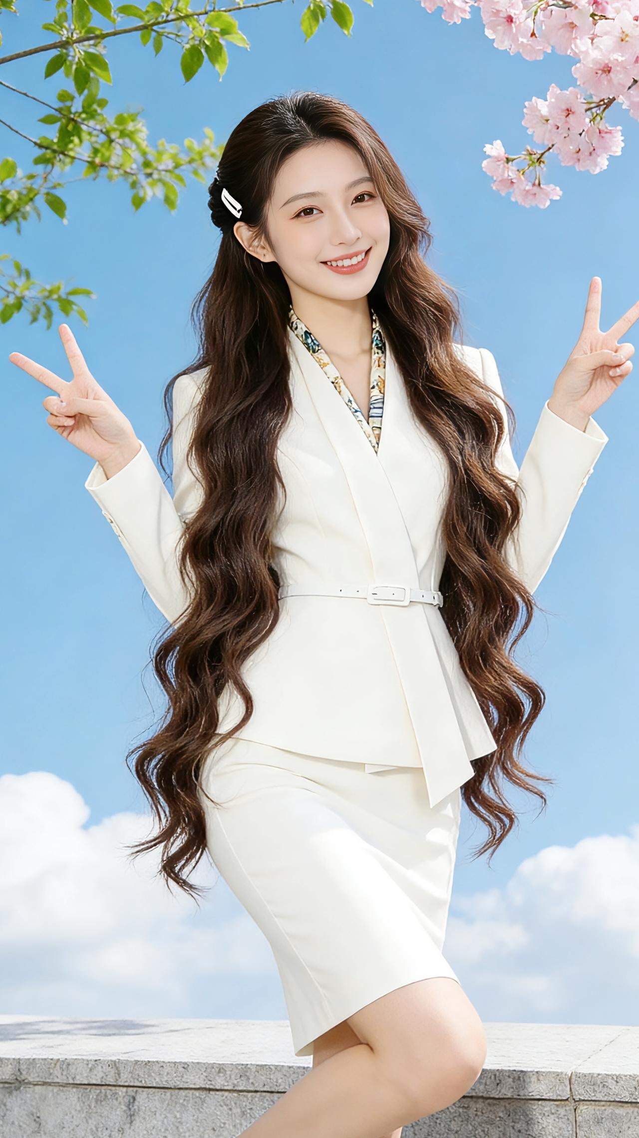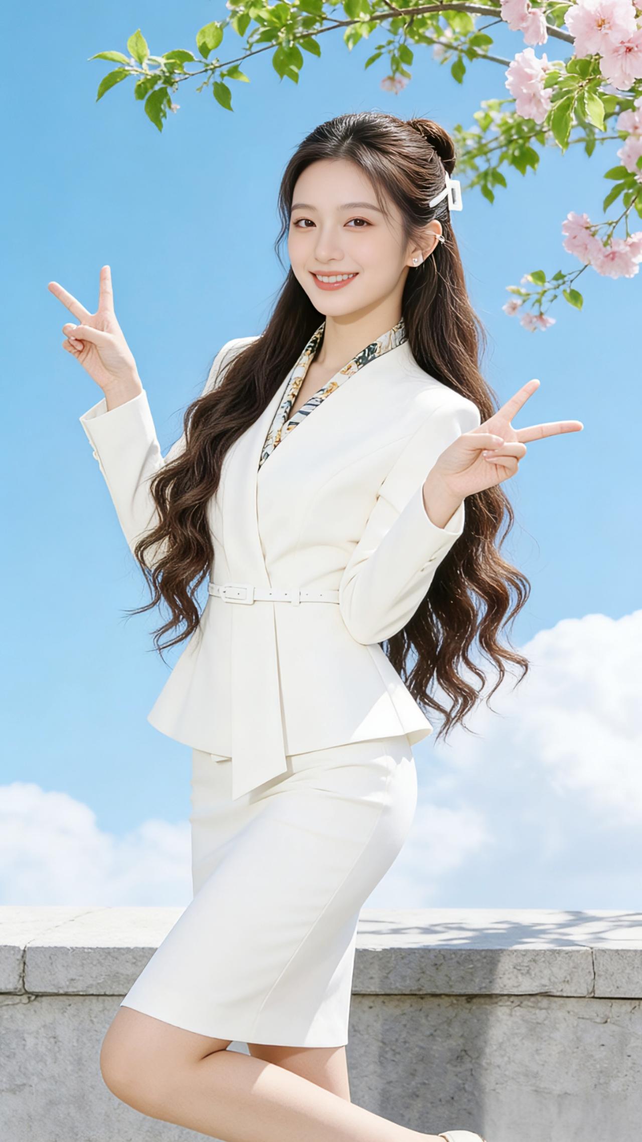春晴里的白与黑 风把云揉成软絮,漫过青蓝的天。石栏边的樱枝垂着粉雾,花瓣轻颤,像藏在风里的心跳。 她倚着石栏,白西装裹着春阳的暖,细带收束腰身,裙摆扫过膝头,像一捧刚融的雪。或是黑裙衬着利落的肩线,丝巾在颈间洇开浅纹,像把春山的雾色系在了心上。发梢垂着卷,白夹扣别起半缕,风过时,卷发便在肩头漾开涟漪。 她比出的“V”字,是春晴里最亮的星;指尖相触的爱心,把风都揉成了软。有时抬手撩发,发梢扫过耳尖,连阳光都慢了半拍;有时背手而立,目光落向云深处,像在等一场不期而遇的风。 白衬衫的木耳边叠着温柔,金扣在光里轻闪,黑裙压着裙摆的弧度,把春的软与飒都收进衣袂。樱瓣落在肩头,她笑时,眼尾弯成了月牙,连风都停在发梢,不肯惊扰这片刻的晴。 春阳正好,风也温柔。她站在樱树下,白与黑的衣袂轻扬,像把整个春天的明媚,都穿在了身上。 高级感穿搭早春穿搭职业装穿搭 西装套装