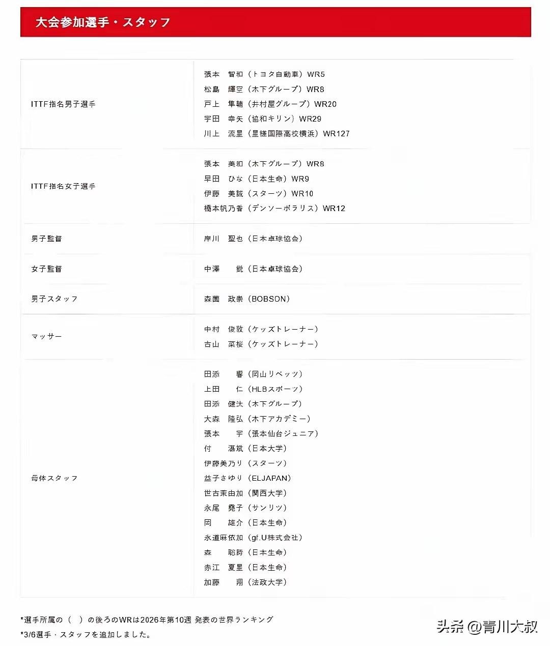 日本世界杯名单出炉了! 世界冠军被放弃! 大赛时, 日本乒协还是信任张本智和与张本美和, 早田希娜和伊藤美诚也被重用了! 由于这次世界杯没有双打, 多哈世乒赛男双冠军大登被放弃了! 宇田是通过选拔赛打上来的, 而川上流星u19冠军! 让日乒想不到的是, 刚给桥本帆乃香报名, 她的技战术就被陈熠破解了!