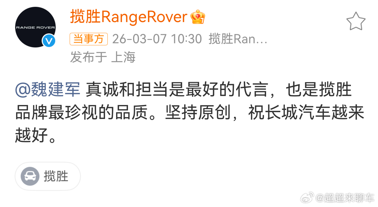 路虎揽胜回应魏建军道歉错了不可怕,可怕的是明知道错了还在这找理由!海报这件事,错了就是错了,长城直接很坦荡的道歉,而换来的也是揽胜的肯定的回应!
