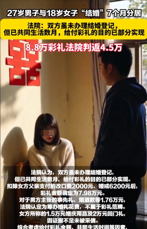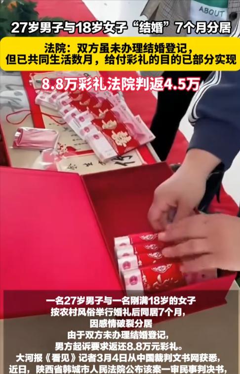 “这门婚事就不该同意!”陕西韩城,一18岁女子嫁给了27岁男子,谁知二人才同居7个月,女子就流产两次。男子因为没有稳定工作,日常开销都需要女子找娘家人要。也正因为如此,二人经常吵架。最终男子起诉了女子,要求其返还88000元的彩礼。可女子一分钱都不想退,她称结婚时陪嫁都有4万元,而因流产还产生的3万元费用。可法院的判决却让女子傻眼了。 3月4日,中国裁判文书网的数据库里悄然滑入一份新的民事判决书。点开这份来自陕西韩城法院的文档,一串悬殊的数字直接把矛盾摊在了桌面上:男方索求8.8万,法槌落下,数字被硬生生砍到了4.5万。 说实话,这案子一出来,评论区直接炸了锅。有人骂渣男,有人说女方也不无辜,但你仔细看完判决书,会发现这事儿远比表面上看起来更荒唐。 退回去盘点这条时间轴,那是两年前发生在当地的一笔"青春坏账"。1996年出生的无业青年文某,撞上了2005年出生的少女许某。27岁对18岁,这场婚事从一开始就踩在法定婚龄的绝对红线外。年龄差距摆在那儿,一个早该成家立业,一个刚刚成年,这种组合本身就透着一股不对劲的味儿。 没有任何合法证件背书,两人全靠一顿乡野酒席确立关系。210天的同居生活,换来的是两张冰冷的流产报告,以及一张带着怒气的8.8万元分手账单。 你没看错,两次怀孕,两次流产。这短短七个月里,一个18岁的女孩身体和心理承受了什么,不用多说。而男方呢?转头就拿着一沓票据冲到法院,把彩礼钱、见面礼、买衣服的钱、甚至连吃饭开房的费用都列得清清楚楚,非要把这笔账算个明明白白。 法院怎么判的?直接把8.8万砍到4.5万,理由很硬核:你们这婚姻压根就不受法律保护,女方未到法定婚龄,同居本身就是违法的。男方给的那些钱,有一部分属于正常恋爱开销,凭什么全让人家退? 更关键的是,法院特别强调了一点:两次流产对女方身心造成的伤害,这个代价谁来补偿?你文某自己心里没点数吗? 看到这儿,很多人可能会问:那女方就一点责任都没有?当然是有的。年满18周岁在法律上已是完全民事行为能力人,理应学会为自己的言行与选择承担相应责任。但问题是,这场关系里,谁占主导地位?27岁的男人和18岁的女孩,谁更有社会经验?谁更懂得保护自己? 说白了,这就是一场彻头彻尾的闹剧。不受法律认可与保障的同居关系,缺少责任与担当的感情,走到最后往往只剩混乱不堪的残局,也让两个人的人生都留下难以愈合的伤痕。 别以为这只是个例。这种打着"结婚"旗号行同居之实的案子,在基层法院简直不要太常见。有些地方重人情轻法律,觉得办了酒席就算数,结果出了事才发现,法律面前,那些所谓的"习俗"根本站不住脚。 这个判决给所有人敲响了警钟:法定婚龄不是摆设,它是保护未成年人和刚成年年轻人的最后一道防线。你以为的"早点成家",可能毁掉的是一个人的一生。 至于那个27岁的文某,拿着判决书上的4.5万,不知道他心里是什么滋味。钱是要回来一半了,但那两条没能来到这个世界的生命,那个18岁女孩身上永远抹不掉的伤痕,这些账,又该怎么算? 参考信息:27岁男子与18岁女子“结婚”7个月分居,法院判决:8.8万元彩礼返还4.5万 2026-03-0417:05·大河报