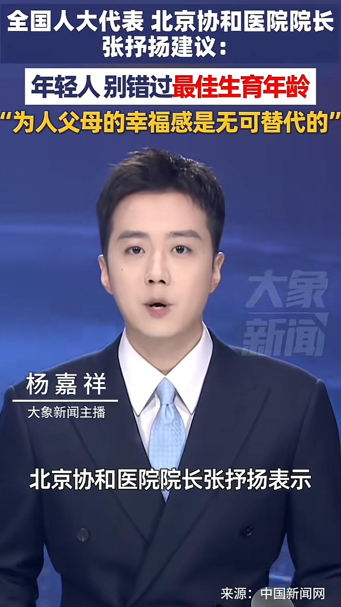 年轻人该结婚结婚,该生孩子生孩子,不要错过最佳生育年龄。 全国人大代表,北京协和医院院长张抒扬,3月5日在两会采访中,建议年轻人尽量早点生育,不要错过最佳年龄。现在不少年轻人,一门心思扑在事业上,想着发展好了再要孩子,可这真不见得对。 要知道,女性24 - 29岁、男性25 - 35岁是最佳生育年龄,过了这村就没这店。这时候身体条件好,生育风险低。 但咱也得说,生娃不是小事,光看年龄可不行。现在生活压力大,经济基础、心理准备都得考虑。不过要是各方面都差不多,趁着身体好要娃,说不定真能收获别样的幸福。大家觉得呢,年轻人该早早生娃吗?