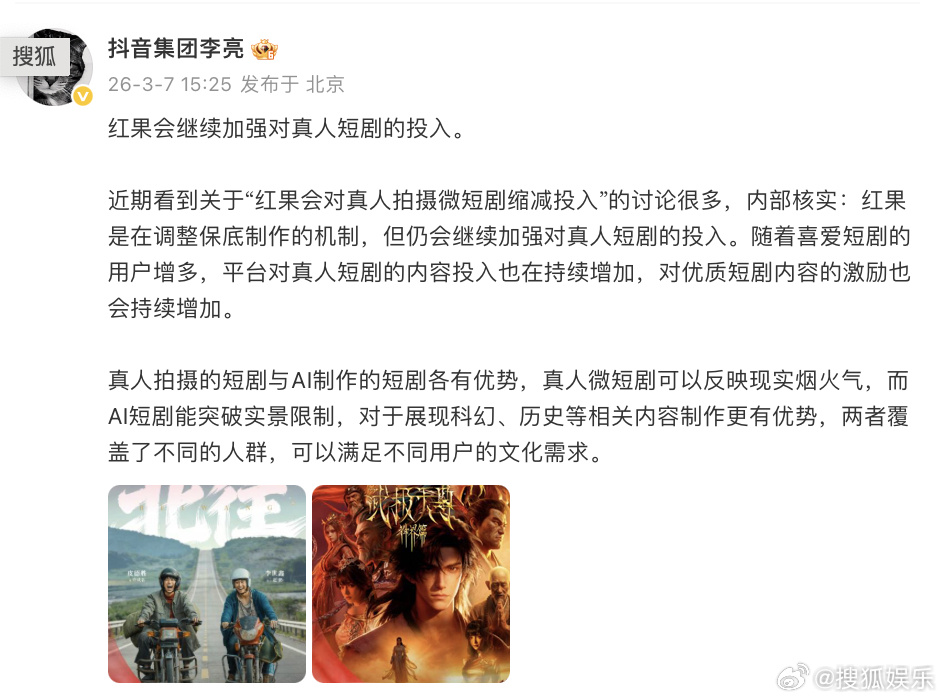 李亮辟谣红果缩减真人短剧投入 就网传“红果批量暂停真人短剧项目”一事,抖音副总裁李亮经内部核实后发文辟谣,表示红果是在调整保底制作的机制,但仍会继续加强对真人短剧的投入。真人短剧和AI短剧各有优势,并不冲突。