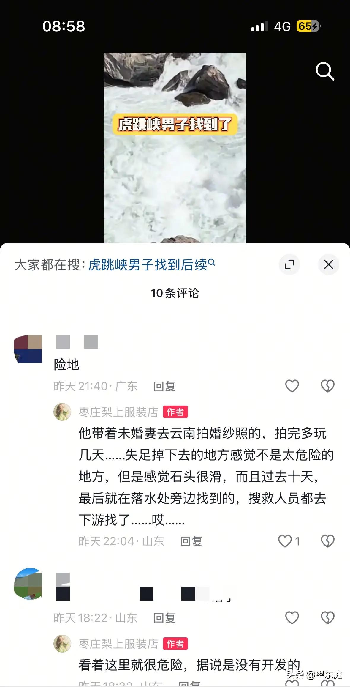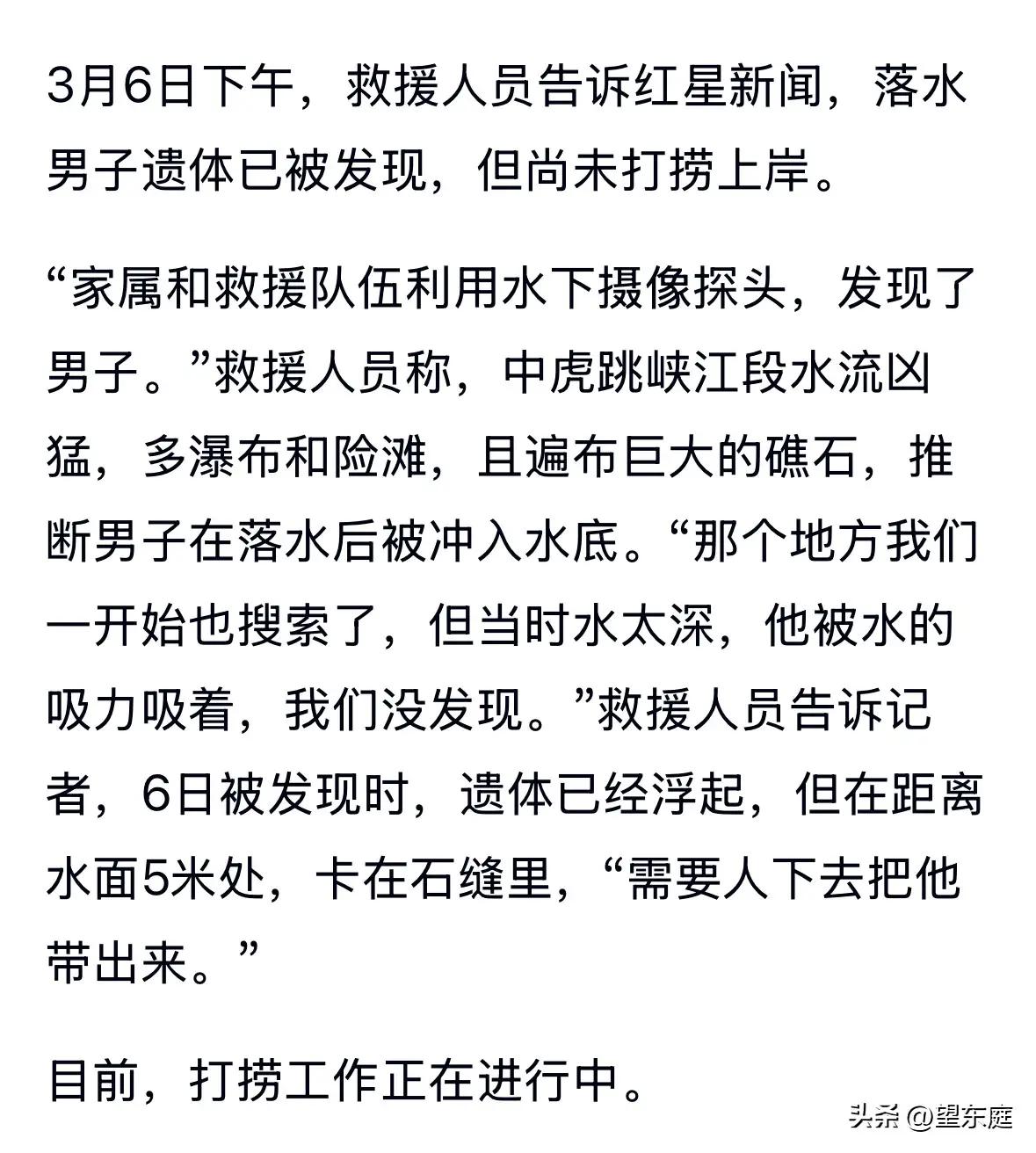 悲痛!在虎跳峡落水的29岁男子遗体被找到了!他是山东枣庄人,之所以去云南,是和女友过去拍婚纱照的。拍完后,他们又多留了几天,想趁着假期好好游览一下云南的大好河山! 这本该是一段充满甜蜜和期待的旅程,却最终以悲剧收场。29岁的他,正值人生最美好的年华,满怀对未来的憧憬和对爱情的坚定承诺。谁能想到,那个阳光灿烂的日子,竟成了生命的最后一刻? 虎跳峡,这个被无数游客赞叹的壮丽景点,今天却成了悲伤的代名词。湍急的江水、险峻的峡谷,既是自然的鬼斧神工,也是生命的无情考验。每年都有无数游客慕名而来,渴望感受大自然的震撼与美丽,但危险也时时潜伏其中。 这起事故,不禁让人反思:我们在追求美景和浪漫的同时,是否真正了解了自然的力量?是否有足够的安全意识和准备?悲剧的背后,是对生命的尊重缺失,还是对风险的轻视? 更令人心碎的是,这对情侣的故事,像极了许多年轻人的缩影——他们渴望用一场婚纱照记录爱情的美好,用一次旅行见证生活的精彩。然而,命运却无情地按下了暂停键,让所有的梦想和期待戛然而止。 网友们纷纷表达了哀悼和惋惜,也有人开始热议旅游安全的问题。有人质疑景区的安全措施是否到位,有人呼吁游客增强自我保护意识,还有人感叹生活的无常和脆弱。 这起事件,提醒我们每一个人:生命无价,安全第一。无论是婚纱照的浪漫,还是旅行的自由,都不能以牺牲生命为代价。我们需要在追求美好生活的同时,学会敬畏自然,珍惜生命。 也让我们看到了亲情与爱情的力量。那位男士的家人、女友,正承受着难以言说的痛苦和失落。我们希望他们能坚强,也希望社会给予更多的关怀和支持。 这场悲剧,也许会成为更多人心中的警钟。愿每一位踏上旅途的人,都能带着安全的意识和对生命的敬重,平安归来。 朋友们,你们有过类似的旅行经历吗?你们怎么看待旅游安全和生命的关系?欢迎在评论区分享你的故事和看法,让我们一起守护每一段美好的旅程,守护每一个珍贵的生命。