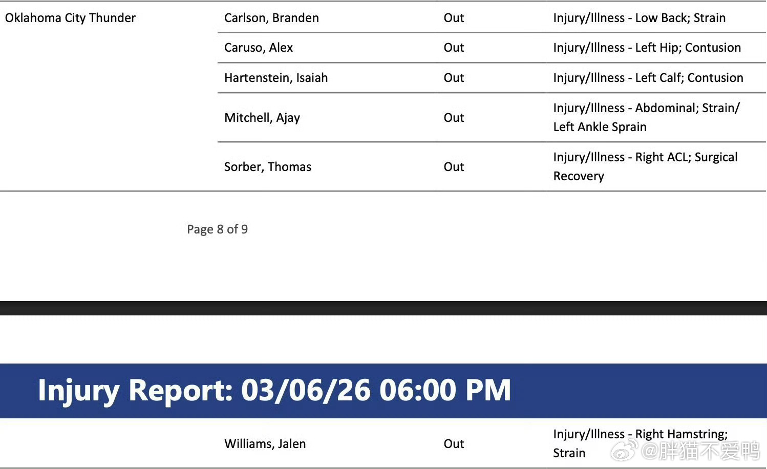 雷霆这边——哈尔滕施泰因、卡鲁索、杰伦威廉姆斯、阿杰伊米切尔、托马斯索伯、布兰登卡尔森明日缺席!