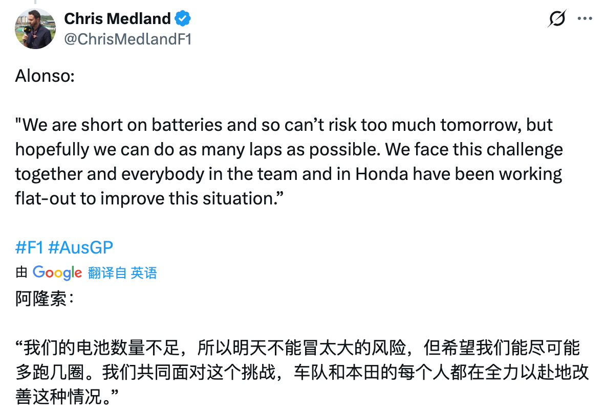 阿隆索:我们的电池数量不足,所以明天不能冒太大的风险,但希望我们能尽可能多跑几圈。我们会共同面对这个挑战,车队和本田的每个人都在全力以赴地改善这种情况。