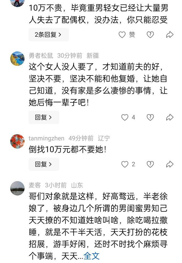 辽宁女子离婚两年后求复婚竟索要10万彩礼,前夫一句“免谈”揭穿现实:你不是回头,是没路可走! 离婚时甩手走得潇洒,两年后回头却带着价码谈判。最近一则辽宁女子的复婚故事刷爆网络,她提出要十万彩礼加房产过户,前夫只冷冷回应“免谈”。这场闹剧背后,藏着的何止是婚姻的博弈,更是成年人最扎心的生存逻辑。 当初她嫌丈夫管束太多,追求情绪价值,刷卡消费、夜夜笙歌。直到离婚后撞上现实南墙,被情人原配殴打索赔,朋友渐行渐远,才恍惚发现——原来前夫默默补上的两万欠款,已是生活最大的温柔。可悲的是,许多人总要摔疼了,才想起曾经平稳的地面。 复婚谈判桌上,她低头认错的话音未落,就急急亮出筹码:十万彩礼,房子过户。仿佛婚姻是场买卖,伤了的心能用钱赎回。前夫看得透彻,只愿搭伙过日子,拒绝领证。不是心狠,而是清醒:有些人回头,不是因为爱,而是因为无路可退。 网友的嘲讽一针见血:“在外面混不下去了,才觉得前夫好,脸咋那么大?”更有人讽刺:“按这操作,每年离婚复婚一次,都能发财了。”玩笑背后,是大众对婚姻儿戏化的反感。婚姻不是游乐场,岂容你想进就进、想出就出? 其实前夫的“免谈”里,藏着多少隐忍与失望。八年婚姻,两个孩子,他独自承担抚养责任,女方连抚养费都未付。如今她回头谈条件,何尝不是对过往责任的二次逃避?男人的底线,不是钱,而是怕再次被掏空后一无所有。 女方真的悔改了吗?行动暴露一切:她可以做饭洗衣,却仍计较彩礼房产。感情里最怕的,就是一方在谈责任,另一方却在算利益。婚姻若是秤,一边放上自私,另一边只会剩下疏离。 如今两人维持着“合作式”同居,比陌生人熟悉,比伴侣生分。这或许是当代婚姻最无奈的写照:折腾一圈,爱已耗尽,只剩责任维系残局。但责任能撑多久?当计较成为习惯,温情早已荡然无存。 这个故事给所有人提了个醒:婚姻不是赌气离场后的退路,而是日常珍惜的共建。别等失去后才想赎回,这世上没有谁会在原地永远等待。破镜或许能重圆,但裂痕永远都在。 (来源:根据辽宁社会新闻及网络热议话题综合撰写) 婚姻现实 人性真相
