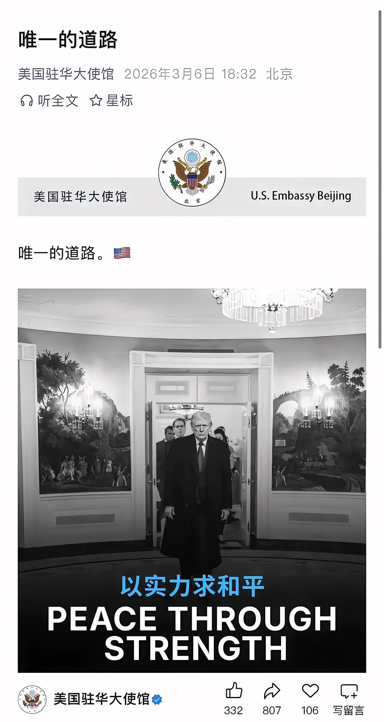 美国驻华大使馆发“以实力求和平”,这说法跟网友提到的“以斗争求和平则和平存”有微妙差异。 美国那套“以实力求和平”,说白了就是仗着自己军事、经济实力强,想靠威慑来维持所谓的和平,就像个霸道大哥,谁不服就用拳头说话。 而“以斗争求和平则和平存”,斗争不是盲目地打打杀杀,是为了争取公平、正义,是在被压迫、被欺负时勇敢站出来反抗。 历史上中国抗美援朝就是以斗争求和平的典范,打出了几十年的和平发展环境。美国那套“实力论”充满霸权色彩,我们的“斗争论”才是真正为了世界和平。