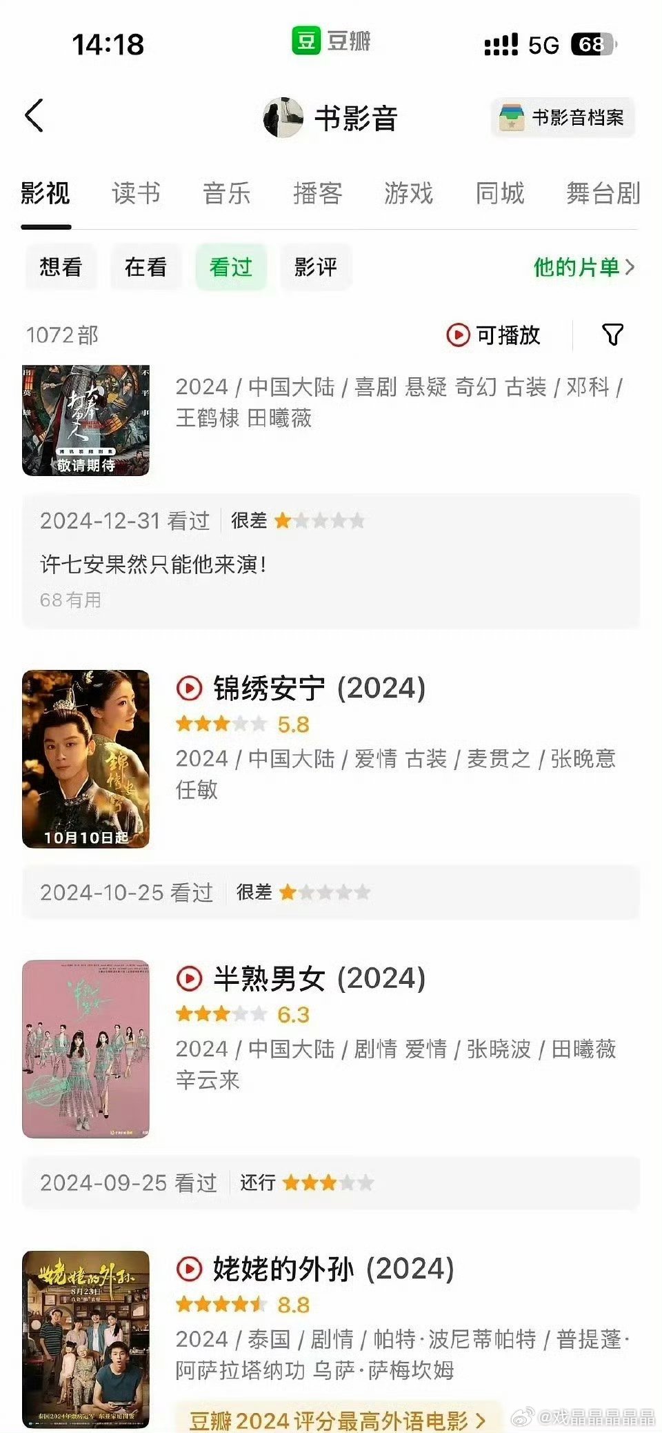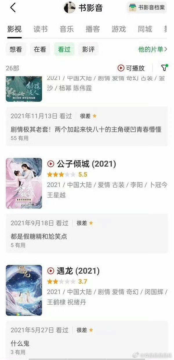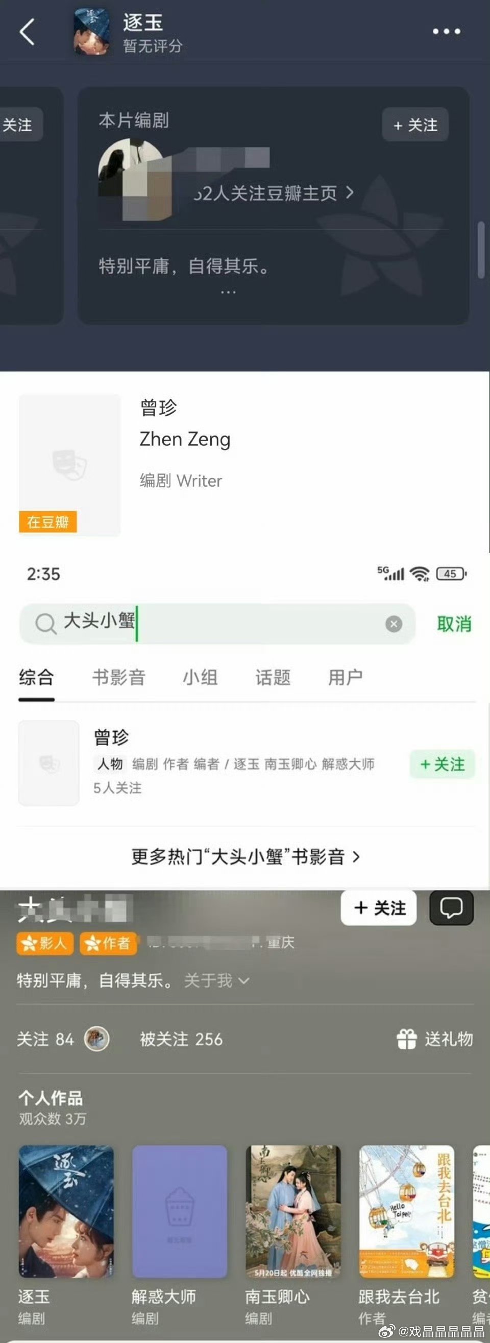 逐玉编剧豆瓣打分疑似编剧曾珍的豆瓣号给好多剧打了一星。
