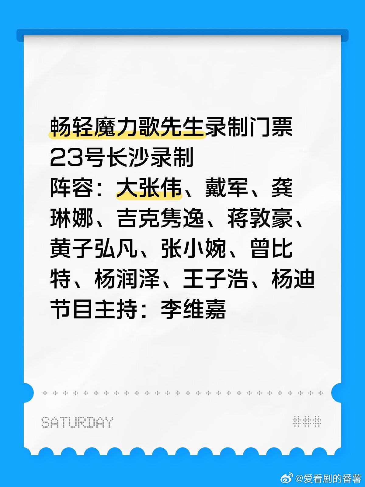 魔力歌先生录制畅轻魔力歌先生录制门票23号长沙录制阵容:大张伟、戴军、龚琳娜、吉克隽逸、蒋敦豪、黄子弘凡、张小婉、曾比特、杨润泽、王子浩、杨迪节目主持:李维嘉