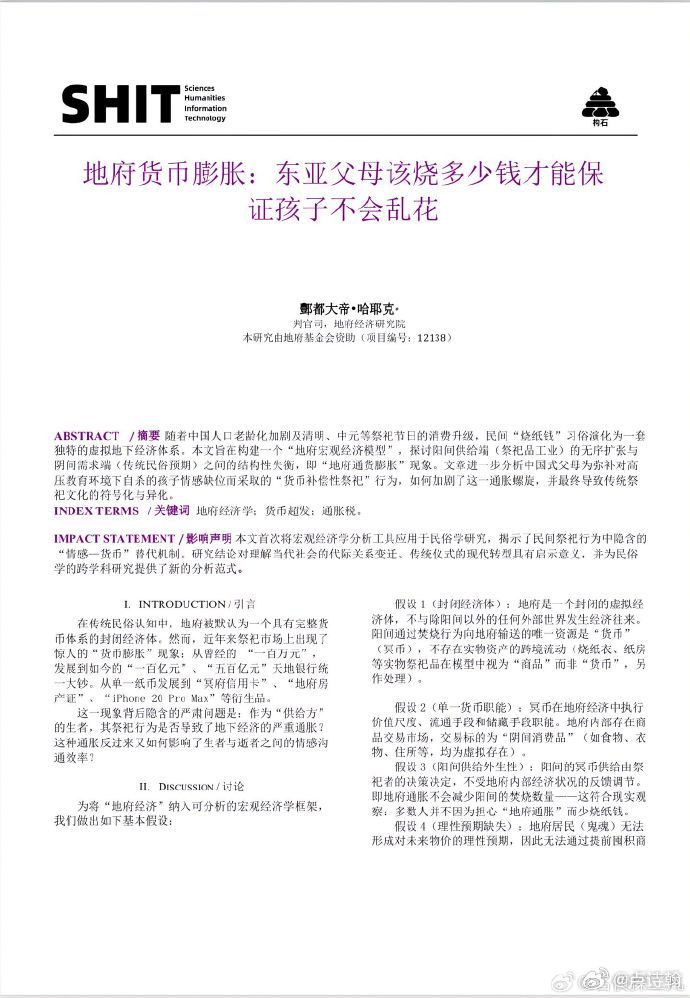 握草,这个阴间通货膨胀的问题,我早几年吐槽我妈烧纸的时候就说过[哭着笑][哭着笑][哭着笑]没想到,现在居然有大神写论文了!牛而比之![点赞][doge]