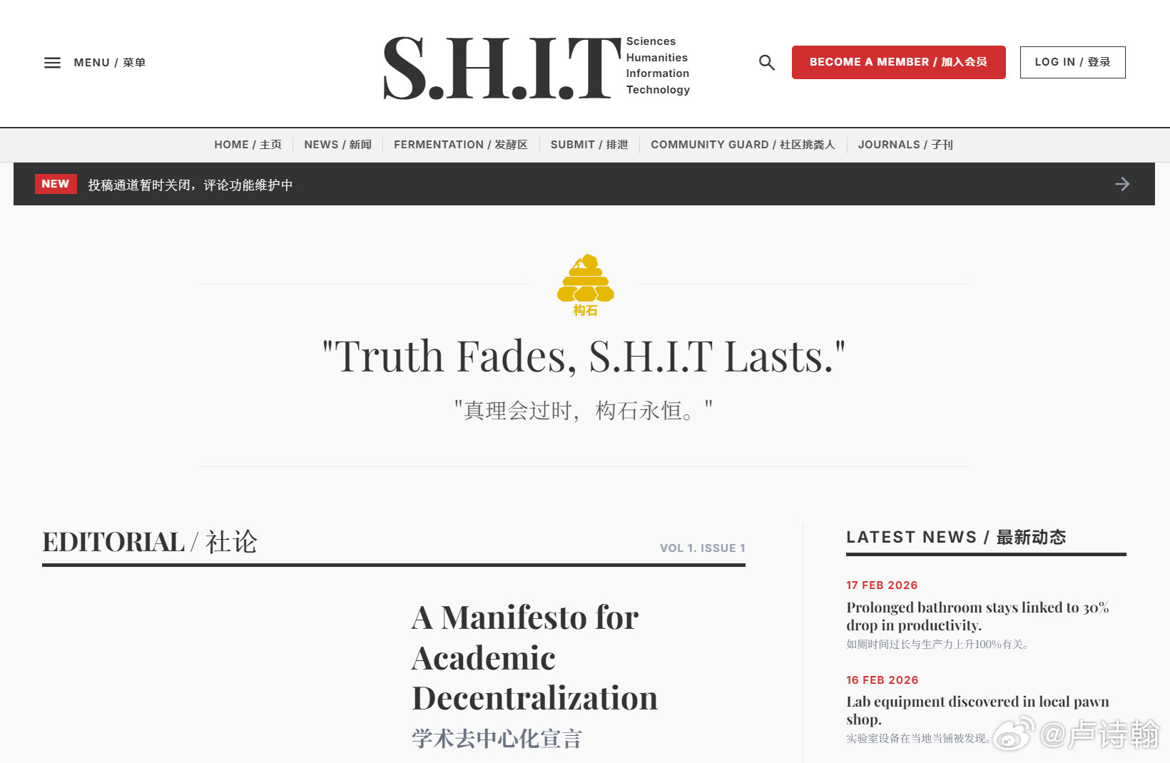 其实一开始,这个属于整活行为。一位研究生小伙伴屡遭拒稿,继而心生悲愤 ,在和评论区大众交流的过程中,产生了为天下同被拒稿学子共建交流之地的想法,怒而创办国内首个影响因子负9.9的不正经期刊《SHIT》。没有版费,没有门槛,有稿就能投,唯一要求是『拒绝平庸和无聊』 。所有被拒稿者都能在这里分享自己的文章,joker等期刊也陆续出现。