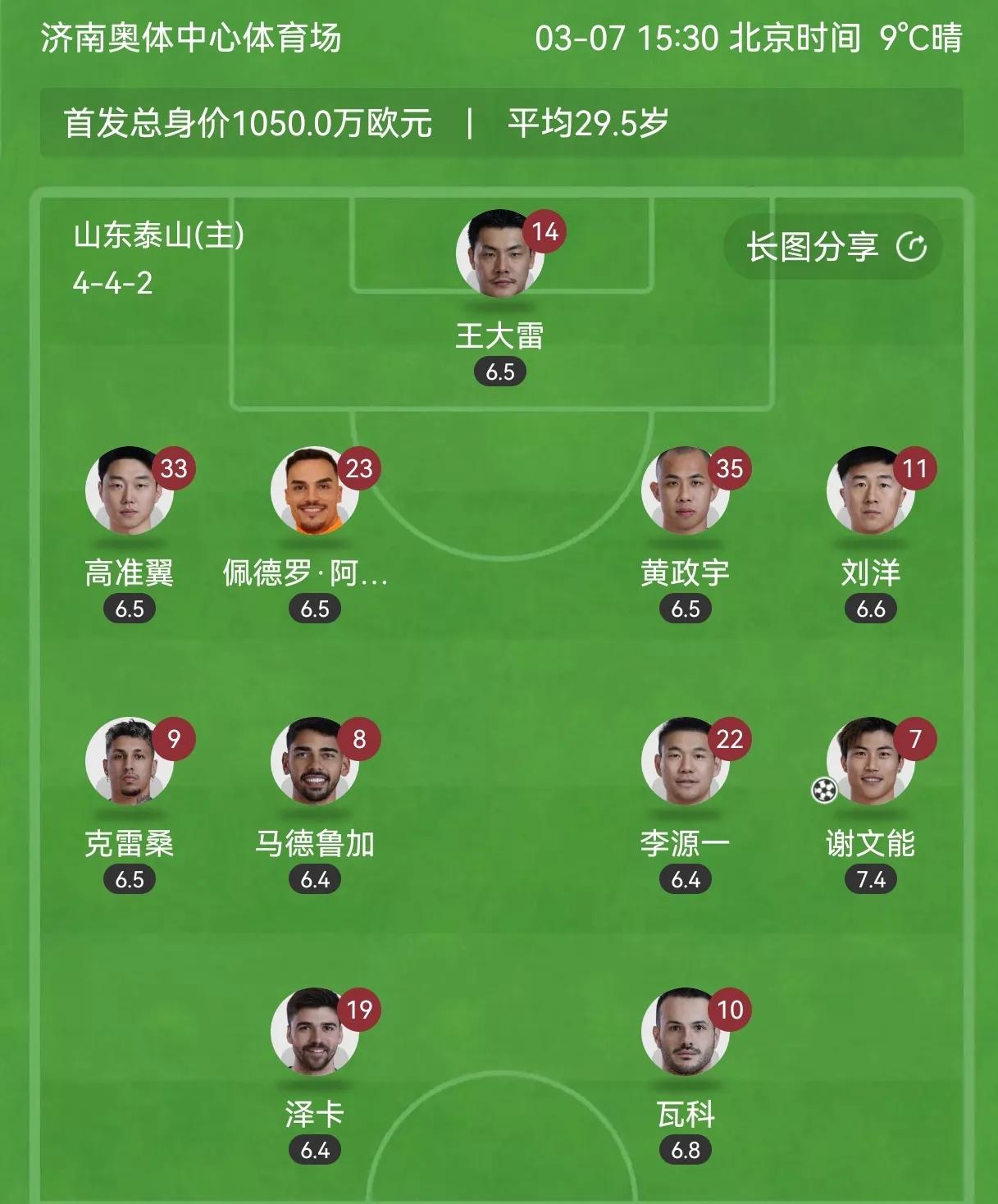泰山首发球员评价榜 上:克雷桑 瓦科 泽卡 谢文能 刘洋 中上:阿尔瓦罗 黄政宇 高准翼 李源一 中:王大雷 马德鲁加 中下:无 下:无 王大雷是因为没什么表现机会,这是好事。马德鲁加很积极,覆盖面大,评分低还是因为在攻防转换这一环节没有梳理能力。 阿尔瓦罗真不错,速度不慢,对抗也还不错,看起来和队友融合的挺好。 陈泽士挺好的,差一点完成一次助攻。陈蒲还是有点糙,有两次比较好的机会,处理球不好。 泰山演了一冬天,又锻炼年轻人、又热身赛输输输,打起正式比赛来,还是这些老将、中生代当家,年轻人也得靠实力竞争,慢慢来吧。 下一轮打国安喽,期待!!!!