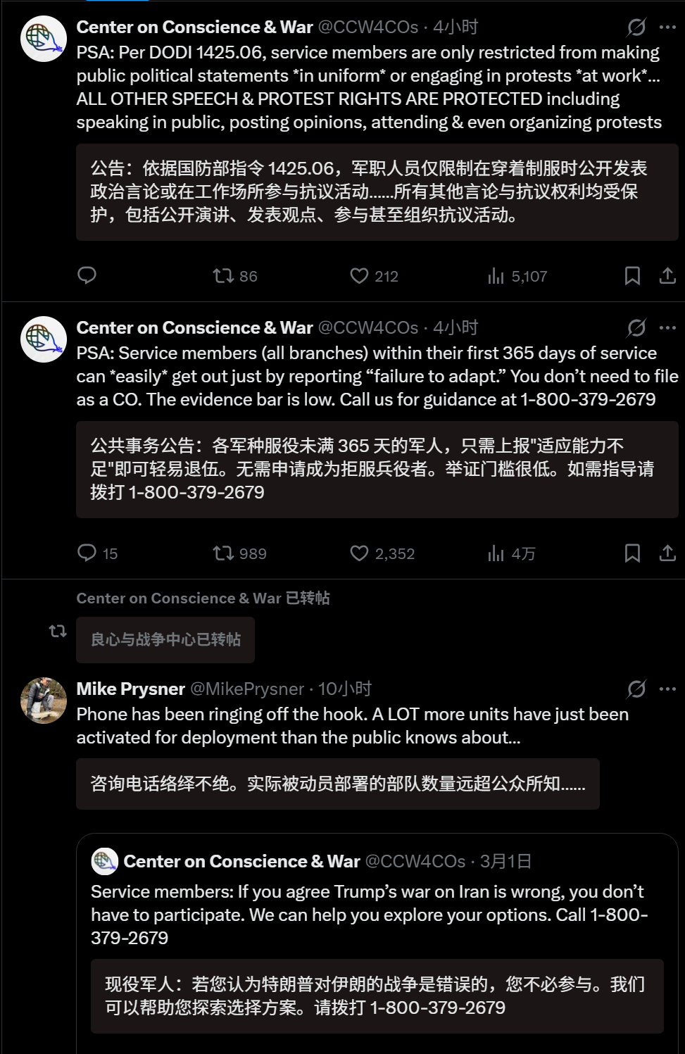 🔻SNN 新闻称:美国“良知与战争中心”(Center on Conscience & War)负责人迈克·普里斯纳(Mike Prisoner)表示,该组织为帮助希望避免参与可能与伊朗战争的美国士兵开设的热线电话,持续不断地接到来电。🔻据他介绍,许多美国军人正在拨打该热线,寻求有关合法拒绝参与与伊朗战争的咨询。🔻该机构还表示:“咨询电话络绎不绝。实际被动员部署的部队数量远超公众所知……”🔻中期选举!伊朗总统称不再首先攻击邻国伊朗不许美以相关船只通过霍尔木兹海外新鲜事中东现场直击