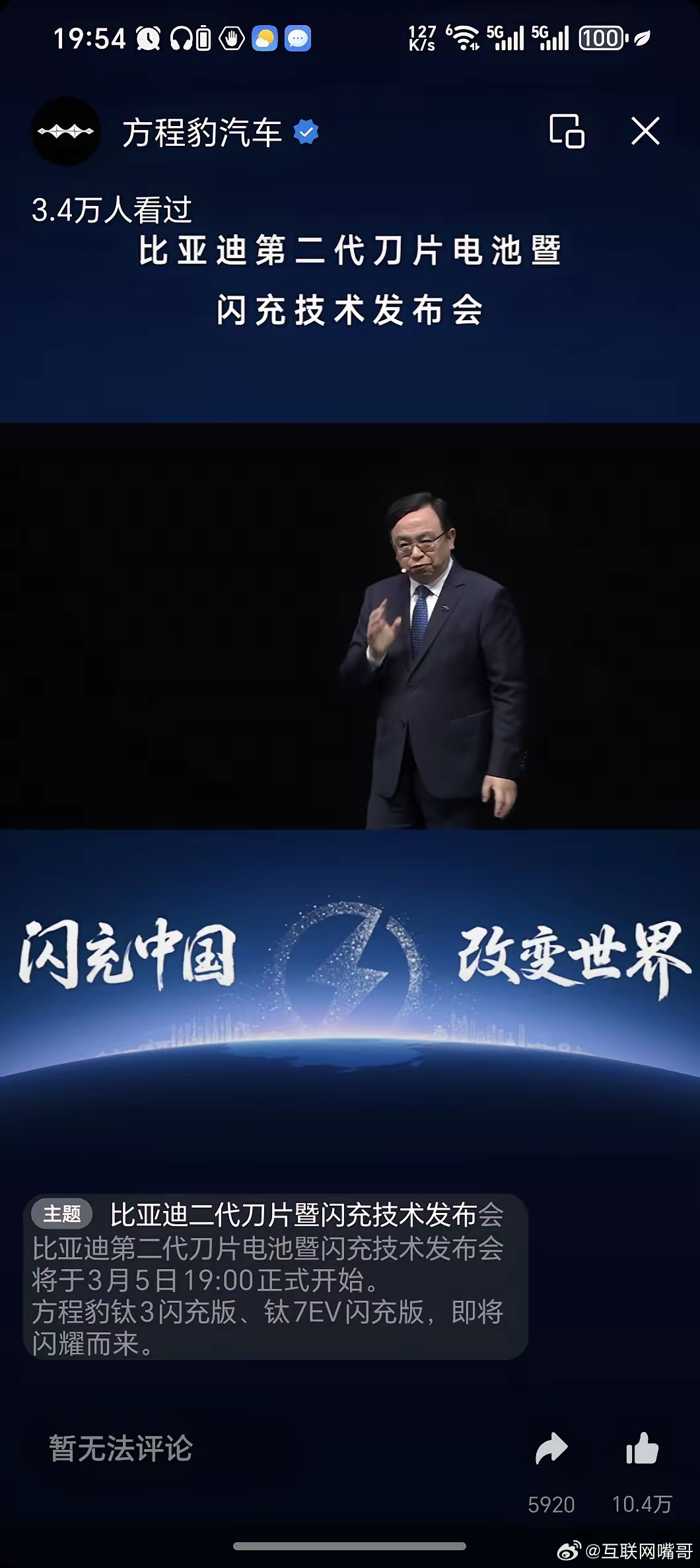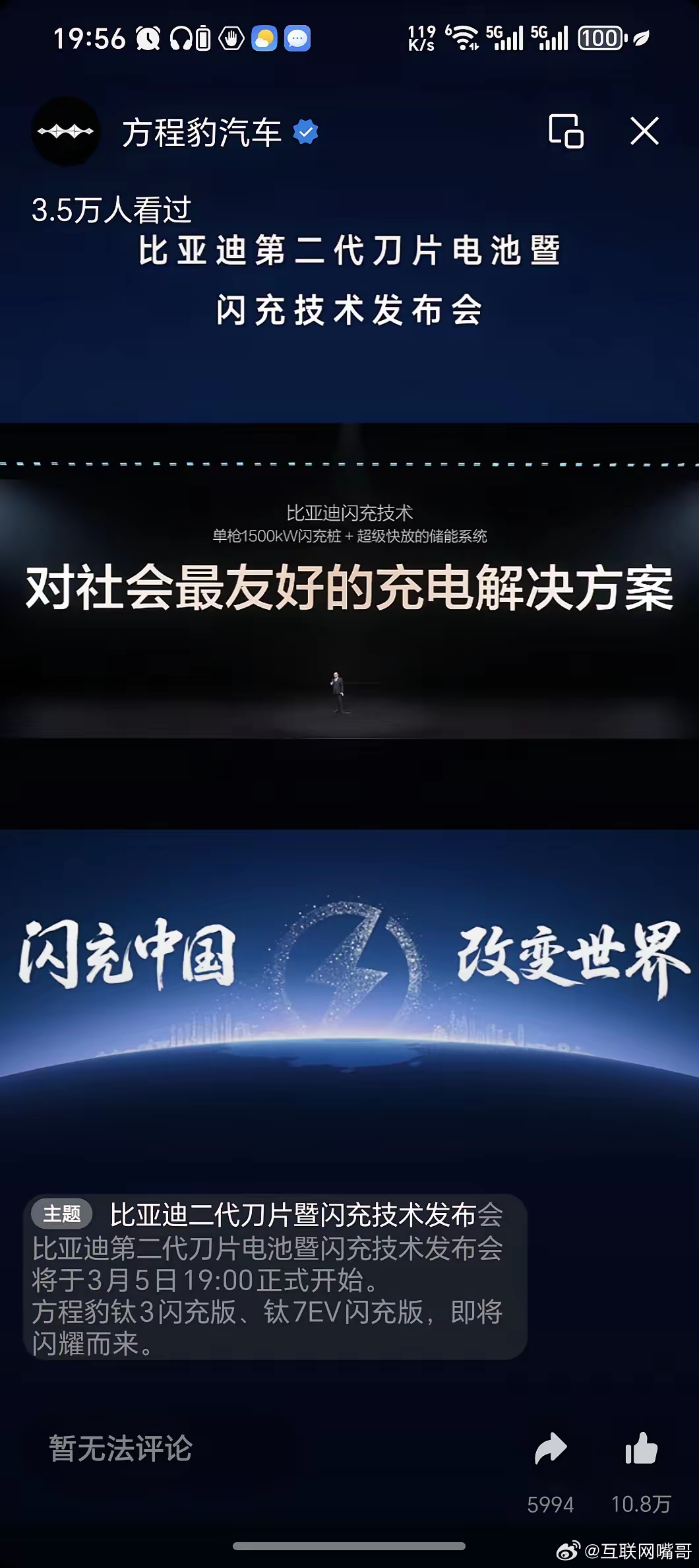 没听到,传福哥有没有说他的第二代刀片电池是不是半固态。但是它真的很猛。这东西数据真的挺猛,5分分钟充好(10-70%),9分钟充饱(97%),续航1000公里,抗冲击10倍国标。而且不玩概念,马上装车。这次还带来超快放储能系统的对社会最友好快充方案。比亚迪闪充还要遍布全中国。比亚迪的大招真的来了,一月销量不行,大招一来,消费者肯定会再次用真金白银支持吧。