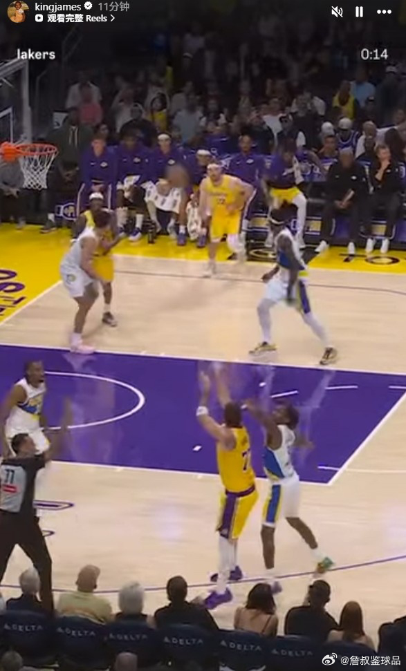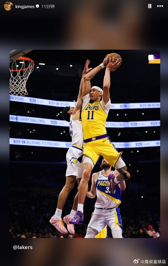 NBA常规赛,湖人主场128-117战胜步行者。赛后,本场缺阵的詹姆斯更新社媒,转发了海斯的隔扣和东契奇的神奇打板三分。