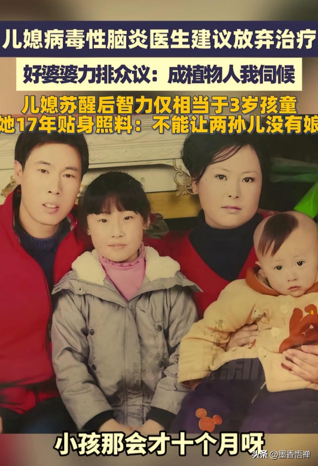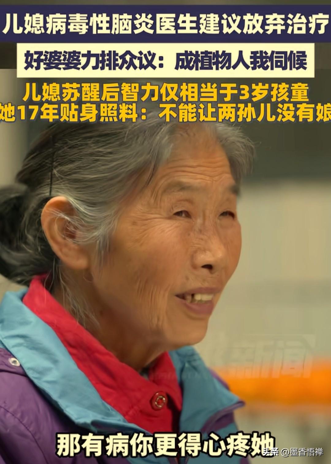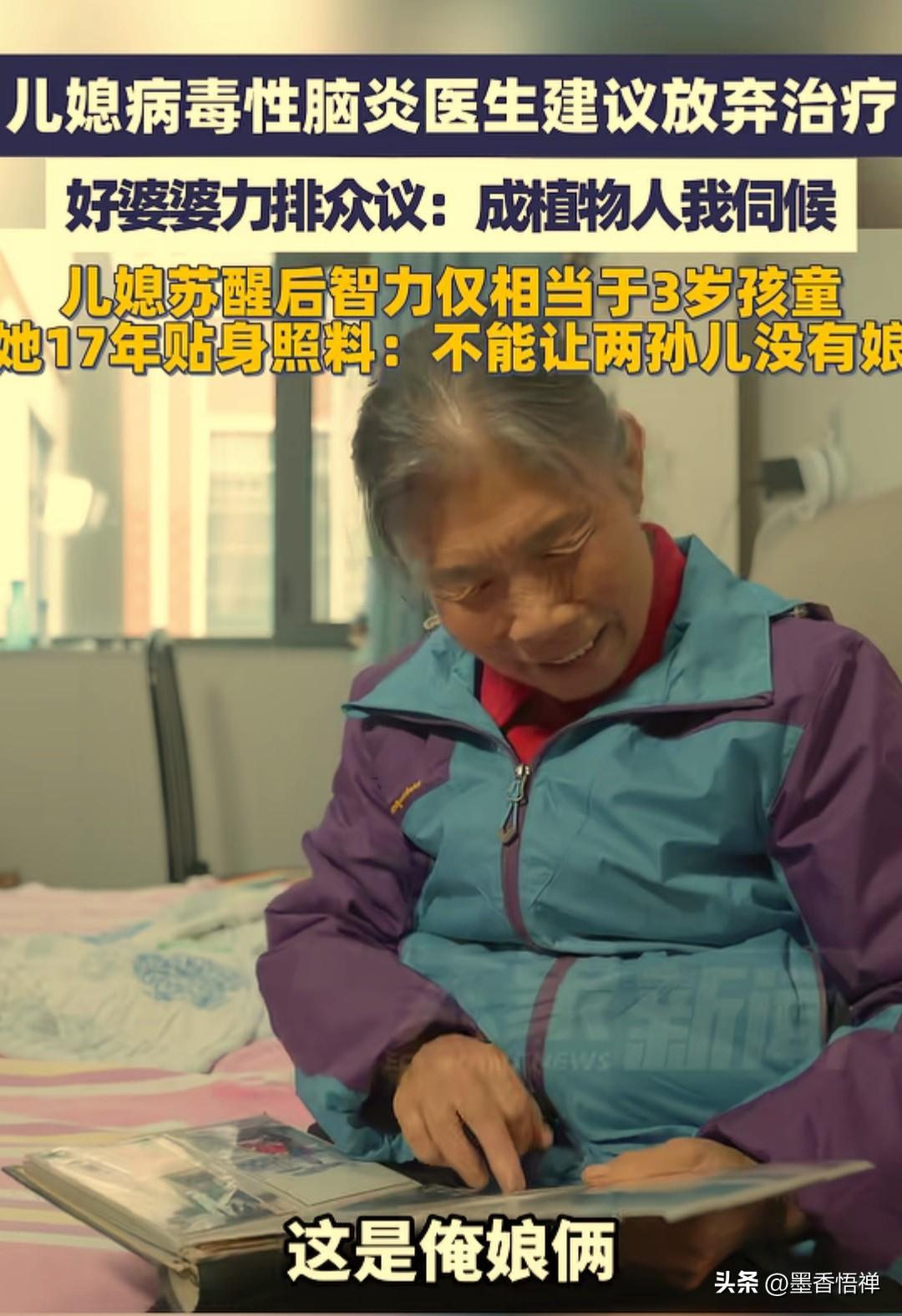 一声婆婆一生妈!儿媳瘫卧17年,她一句“植物人我伺候”,河南七旬老人撑起整个家 在河南获嘉县,有位叫张宝珠的婆婆,被大家叫做“好婆婆”,但这三个字背后,藏着17年的心酸,藏着一个婆婆最沉的爱。 每天清晨,74岁的张宝珠都会坐在院子里,阳光洒在她花白的头发上,她手里拿着一把木梳,正小心翼翼的给面前的“孩子”梳头。她动作很慢,生怕扯疼了对方。这个“孩子”,其实就是她的儿媳吕银玲,今年已经47岁了。 2008年,刚生完二胎没多久,年仅29岁的儿子吕银玲突然患上病毒性脑炎,被送进医院时已经失去自主意识。医生摇着头语气沉重的说,情况太严重,建议放弃治疗,说“就算救回来,也是植物人”。 换做普通人,可能早就打退堂鼓了。但张宝珠没有,亲戚朋友也围着劝她“算了吧,你还有孙子带,别把自己拖垮了。”一边是尚在襁褓中嗷嗷待哺的孙女,一边是躺在ICU里毫无声息的儿媳。 当所有人的劝说指向同一个理性的结局,那就是放弃。但她站在病房外,流着泪说:“她能叫我一声妈,就是我的闺女,只要人还在,这个家就不能散。就算成植物人,我伺候她一辈子!” 就这一句话,撑起了整个家。在煎熬了28天后,奇迹发生了,儿媳的命抢救回来了。但是儿媳醒过来后,智力退到了3岁小孩的水平,连简单的话都说不清楚,生活完全不能自理。那时候,两个孙儿还小,家里的重担全压在了张宝珠一个人身上。 从那天起,17个春秋,6000多个日夜,她每天重复着同样的事: 清晨给儿媳擦身、喂饭、按摩, 白天抱着儿媳晒太阳、陪她说话,带她一起锻炼,晚上守着儿媳睡觉,生怕她出一点意外。 在张宝珠无微不至的照顾下,奇迹也再一次降临。那个曾经被医生判了“死刑”的植物人儿媳,竟然慢慢的会走了,会唱歌了,甚至还会拿起笔画画了。 有人问她累不累?苦不苦?她总是笑笑摇摇头,眼神里全是满足,说:“累也得撑,我走了,儿媳咋办?孙儿咋办?” 她没有惊天动地的壮举,没有华丽的语言,就用最朴素的坚持,把“儿媳”当成亲闺女,把“家”当成全部。 为了挣钱给妻子治病,为了偿还当年欠下的医疗费,儿子郭先生开起了出租车。他早出晚归,风里来雨里去,恨不得把一天掰成两天用。为了省钱,他整整7年没有给自己买过一件新衣服。上衣穿了七八年,裤子是朋友孩子穿剩下的。 面对妻子的愧疚,这个朴实的汉子只是轻声安慰:“钱没了可以再挣。只要你在,孩子有妈,我就有奔头。” 2023年,张宝珠被村民一致评选为“好婆婆”,随后更是被评为河南省“乡村光荣榜”好婆婆、新乡市道德模范。当敲锣打鼓的荣誉送到家门口时,这个74岁的老人笑得有些腼腆。 如今,孙女已经长大即将大学毕业。张宝珠说,她还有一个心愿:“等孙女大学毕业了,我就安安心心在家,伺候着俺娘俩。” 现在,两个孙儿懂事又孝顺。他们知道,是奶奶用一生的爱,留住了妈妈,撑起了这个家。 这个世界上最珍贵的爱,从来不是轰轰烈烈,而是细水长流的坚守。 张婆婆用17年告诉我们:这世间最暖的亲情,不是你有钱时我围着你转,而是你落难时,哪怕全世界都劝你放弃,她也会拼尽全力拉住你,绝不松手。 来源:大象新闻
